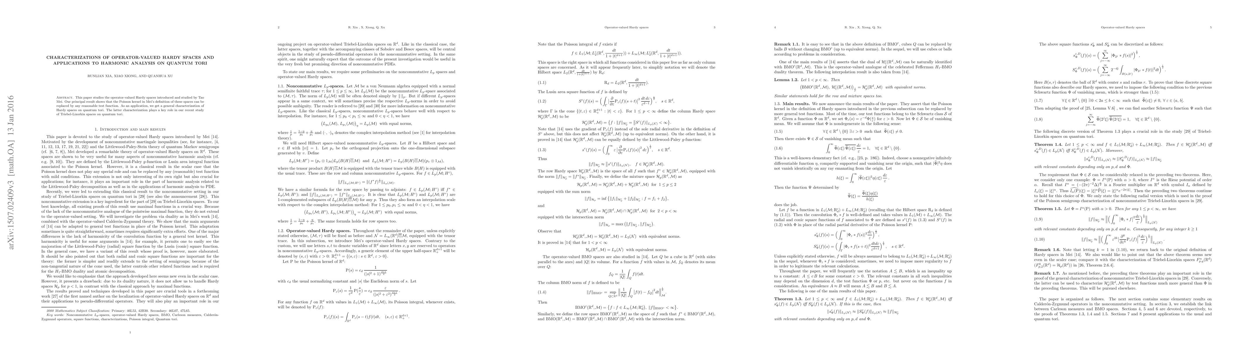 This paper characterizes operator-valued Hardy spaces by replacing the Poisson kernel with any reasonable test function, leading to a general characterization of Hardy spaces on quantum tori, which is crucial for studying Triebel-Lizorkin spaces on quantum tori.