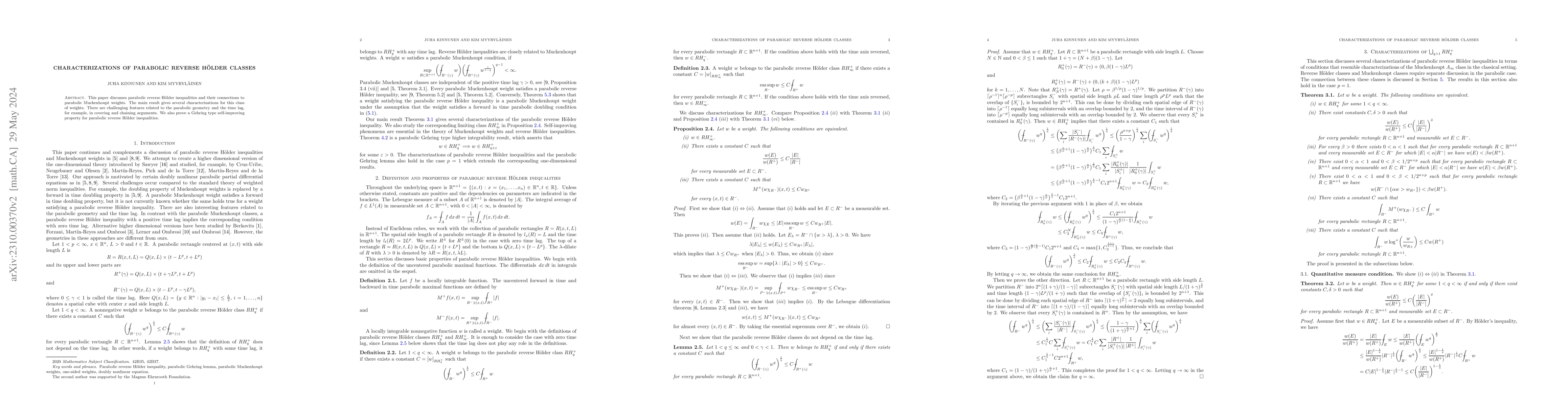 This paper characterizes parabolic reverse Hölder classes through inequalities and connections to parabolic Muckenhoupt weights, including a Gehring type self-improving property, addressing the complexities of parabolic geometry and time lag.