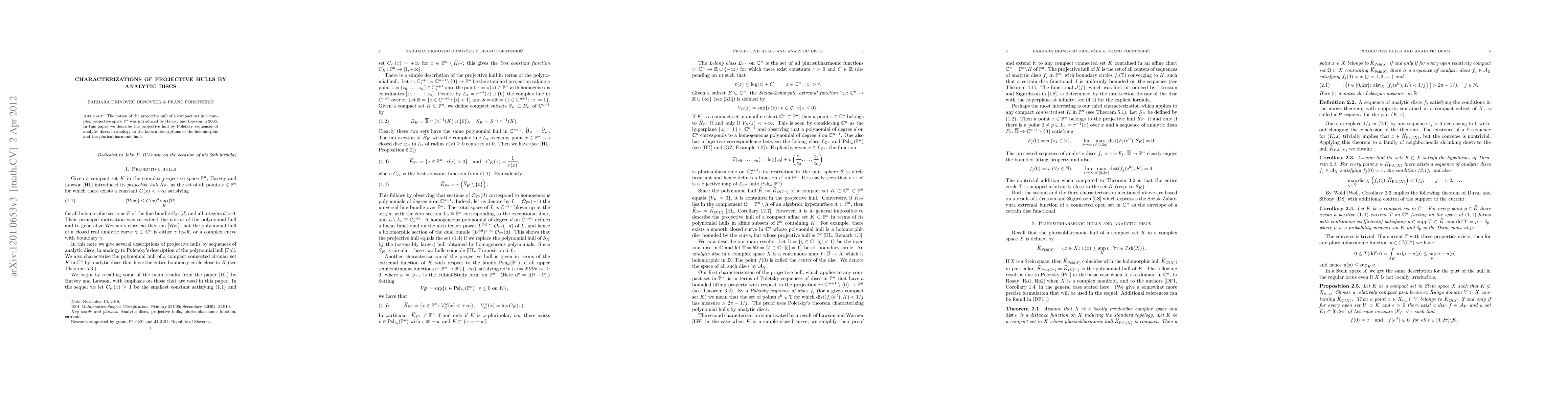 This paper characterizes the projective hull of a compact set in complex projective space using Poletsky sequences of analytic discs, extending known descriptions of holomorphic and plurisubharmonic hulls. The focus is on providing an analogous framework for the projective hull.