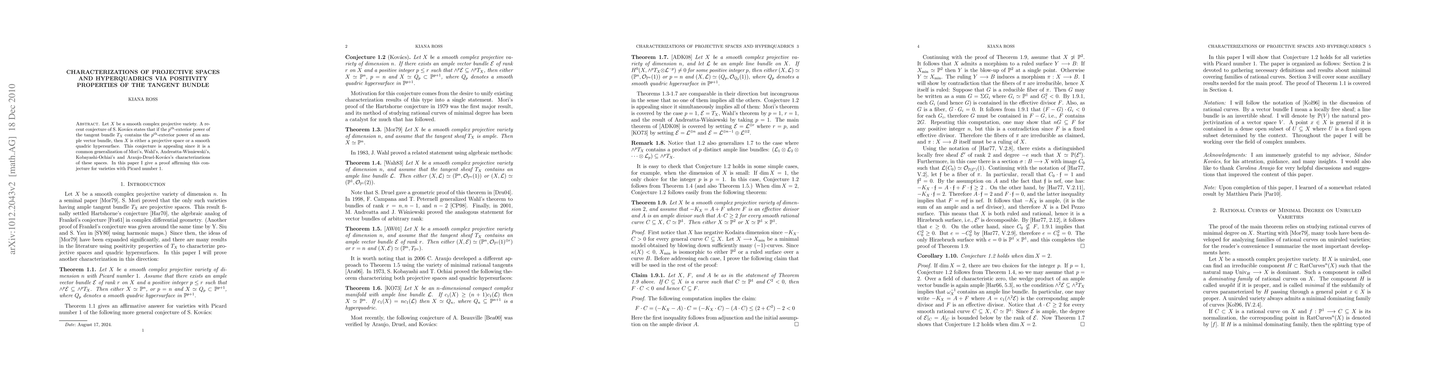 This paper proves S. Kovács' conjecture that if the $p^{\text{th}}$-exterior power of the tangent bundle of a smooth complex projective variety contains the $p^{\text{th}}$-exterior power of an ample vector bundle, then the variety is either a projective space or a smooth quadric, specifically for varieties with Picard number 1.