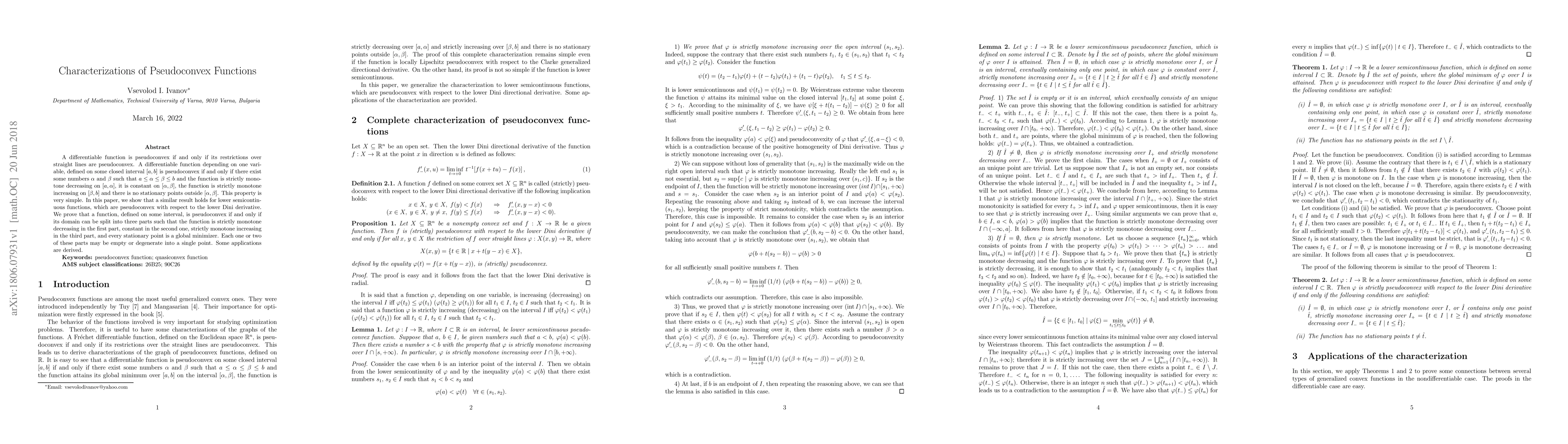 A differentiable function is pseudoconvex if and only if its restrictions over straight lines are pseudoconvex. A differentiable function depending on one variable, defined on some closed interval $[a,b]$ is pseudoconvex if and only if there exist some numbers $\alpha$ and $\beta$ such that $a\le\alpha\le\beta\le b$ and the function is strictly monotone decreasing on $[a,\alpha]$, it is constant on $[\alpha,\beta]$, the function is strictly monotone increasing on $[\beta,b]$ and there is no stationary points outside $[\alpha,\beta]$. This property is very simple. In this paper, we show that a similar result holds for lower semicontinuous functions, which are pseudoconvex with respect to the lower Dini derivative. We prove that a function, defined on some interval, is pseudoconvex if and only if its domain can be split into three parts such that the function is strictly monotone decreasing in the first part, constant in the second one, strictly monotone increasing in the third part, and every stationary point is a global minimizer. Each one or two of these parts may be empty or degenerate into a single point. Some applications are derived.