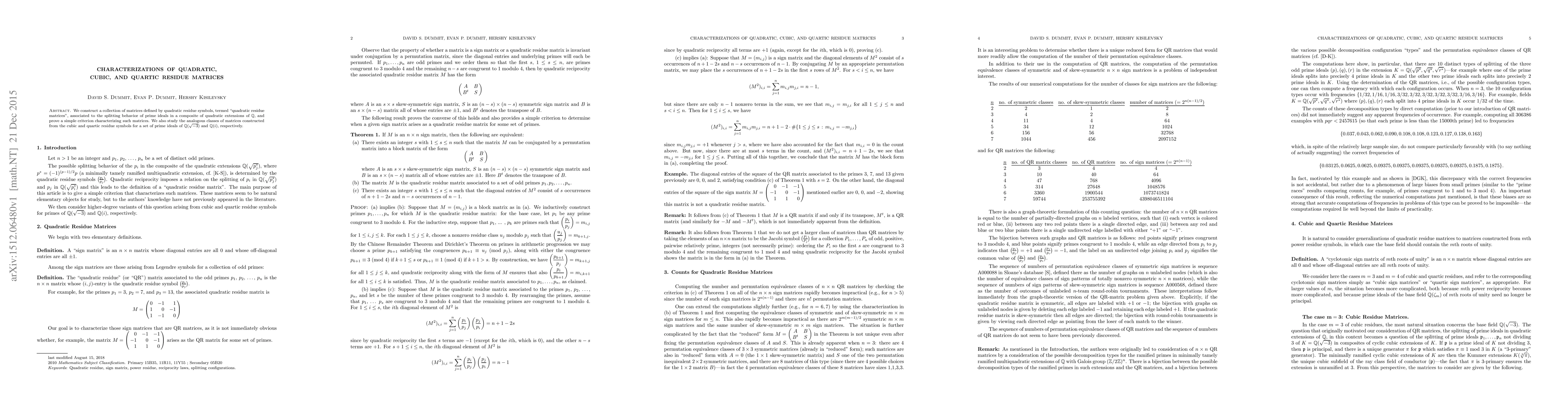 We construct a collection of matrices defined by quadratic residue symbols, termed "quadratic residue matrices", associated to the splitting behavior of prime ideals in a composite of quadratic extensions of $\mathbb{Q}$, and prove a simple criterion characterizing such matrices. We also study the analogous classes of matrices constructed from the cubic and quartic residue symbols for a set of prime ideals of $\mathbb{Q}(\sqrt{-3})$ and $\mathbb{Q}(i)$, respectively.