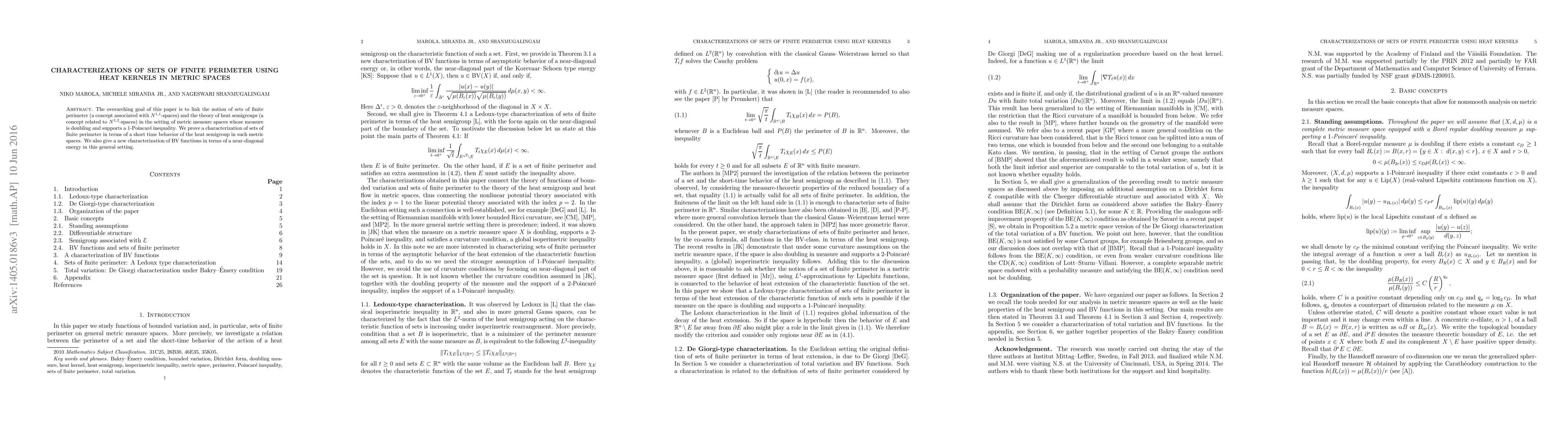 The overarching goal of this paper is to link the notion of sets of finite perimeter (a concept associated with $N^{1,1}$-spaces) and the theory of heat semigroups (a concept related to $N^{1,2}$-spaces) in the setting of metric measure spaces whose measure is doubling and supports a $1$-Poincar\'e inequality. We prove a characterization of sets of finite perimeter in terms of a short time behavior of the heat semigroup in such metric spaces. We also give a new characterization of ${\rm BV}$ functions in terms of a near-diagonal energy in this general setting.