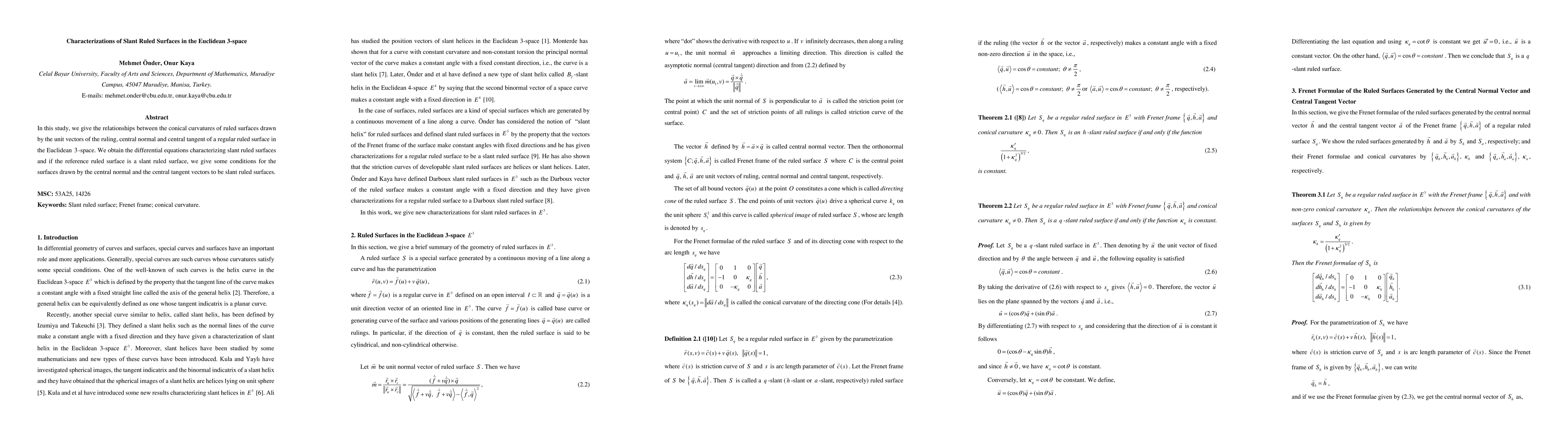 This paper explores the relationships between conical curvatures in slant ruled surfaces, deriving differential equations that characterize them and providing conditions under which surfaces formed by central normal and tangent vectors are themselves slant ruled surfaces.