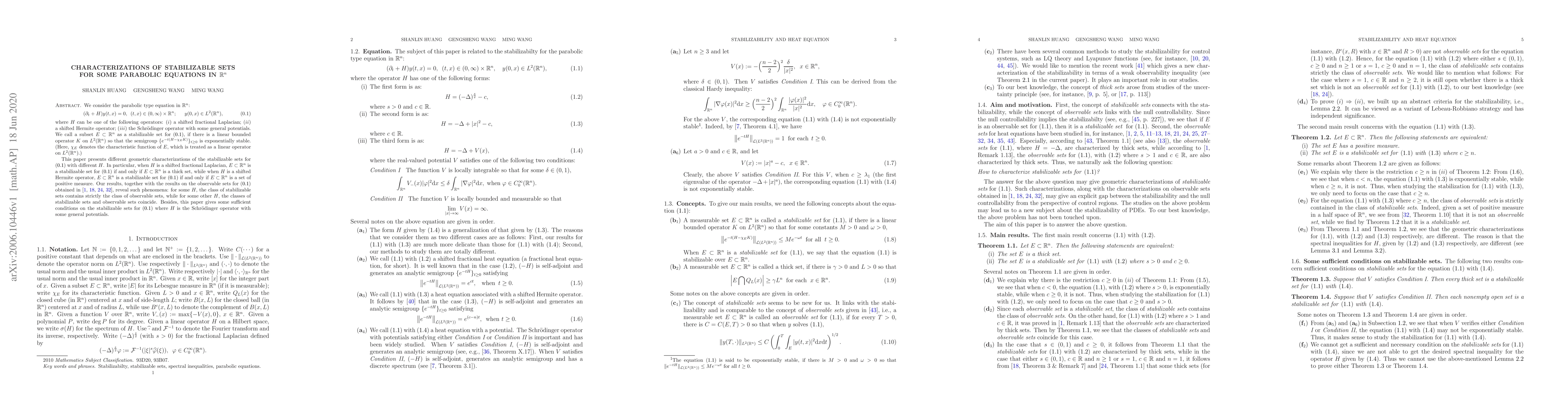 We consider the parabolic type equation in $\mathbb{R}^n$: \begin{align}\label{equ-0} (\partial_t+H)y(t,x)=0,\,\,\, (t,x)\in (0,\infty)\times\mathbb{R}^n;\;\; \quad y(0,x)\in L^2(\mathbb{R}^n), \end{align} where $H$ can be one of the following operators: (i) a shifted fractional Laplacian; (ii) a shifted Hermite operator; (iii) the Schr\"{o}dinger operator with some general potentials. We call a subset $E\subset \mathbb{R}^n$ as a stabilizable set for the above equation, if there is a linear bounded operator $K$ on $L^2(\mathbb{R}^n)$ so that the semigroup $\{e^{-t(H-\chi_EK)}\}_{t\geq 0}$ is exponentially stable. (Here, $\chi_E$ denotes the characteristic function of $E$, which is treated as a linear operator on $L^2(\mathbb{R}^n)$.) This paper presents different geometric characterizations of the stabilizable sets for the above equation with different $H$. In particular, when $H$ is a shifted fractional Laplacian, $E\subset \mathbb{R}^n$ is a stabilizable set if and only if $E\subset \mathbb{R}^n$ is a thick set, while when $H$ is a shifted Hermite operator, $E\subset \mathbb{R}^n$ is a stabilizable set for if and only if $E\subset \mathbb{R}^n$ is a set of positive measure. Our results, together with the results on the observable sets for the above equation obtained in \cite{AB,Ko,Li,M09}, reveal such phenomena: for some $H$, the class of stabilizable sets contains strictly the class of observable sets, while for some other $H$, the classes of stabilizable sets and observable sets coincide. Besides, this paper gives some sufficient conditions on the stabilizable sets for the above equation where $H$ is the Schr\"{o}dinger operator with some general potentials.
