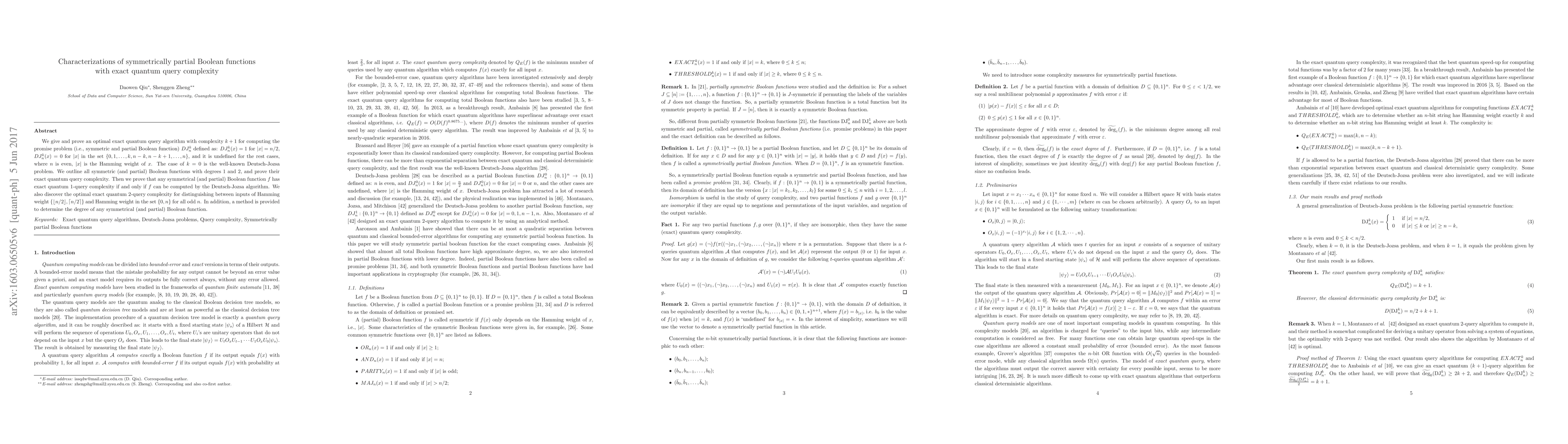 We give and prove an optimal exact quantum query algorithm with complexity $k+1$ for computing the promise problem (i.e., symmetric and partial Boolean function) $DJ_n^k$ defined as: $DJ_n^k(x)=1$ for $|x|=n/2$, $DJ_n^k(x)=0$ for $|x|$ in the set $\{0, 1,\ldots, k, n-k, n-k+1,\ldots,n\}$, and it is undefined for the rest cases, where $n$ is even, $|x|$ is the Hamming weight of $x$. The case of $k=0$ is the well-known Deutsch-Jozsa problem. We outline all symmetric (and partial) Boolean functions with degrees 1 and 2, and prove their exact quantum query complexity. Then we prove that any symmetrical (and partial) Boolean function $f$ has exact quantum 1-query complexity if and only if $f$ can be computed by the Deutsch-Jozsa algorithm. We also discover the optimal exact quantum 2-query complexity for distinguishing between inputs of Hamming weight $\{ \lfloor n/2\rfloor, \lceil n/2\rceil \}$ and Hamming weight in the set $\{ 0, n\}$ for all odd $n$. In addition, a method is provided to determine the degree of any symmetrical (and partial) Boolean function.