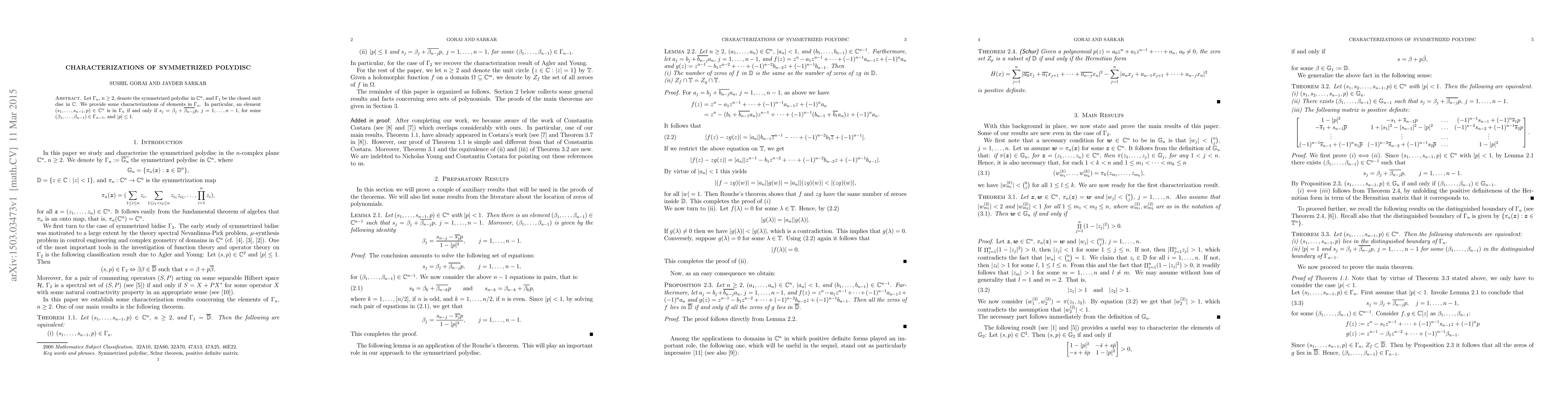 Let $\Gamma_n$, $n \geq 2$, denote the symmetrized polydisc in $\mathbb{C}^n$, and $\Gamma_1$ be the closed unit disc in $\mathbb{C}$. We provide some characterizations of elements in $\Gamma_n$. In particular, an element $(s_1, \ldots, s_{n-1}, p) \in \mathbb{C}^n$ is in $\Gamma_n$ if and only if $s_j = \beta_j + \overline{\beta_{n-j}} p$, $j = 1, \ldots, n-1$, for some $(\beta_1, \ldots, \beta_{n-1}) \in \Gamma_{n-1}$, and $|p| \leq 1$.