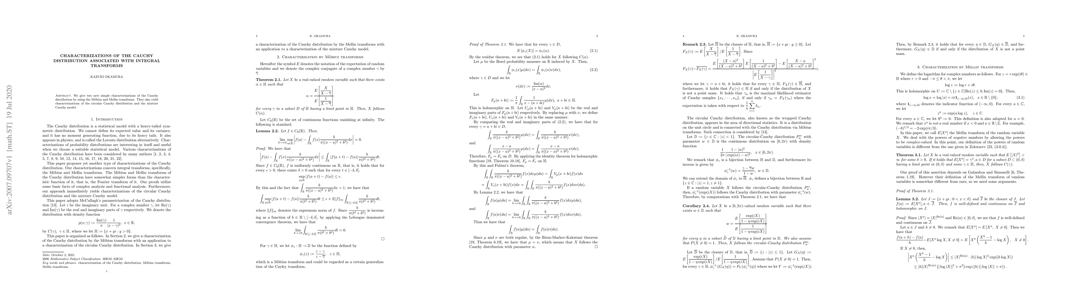 Summary: This paper presents two new characterizations of the Cauchy distribution using the Möbius and Mellin transforms, and extends these findings to the circular Cauchy distribution and the mixture Cauchy model.