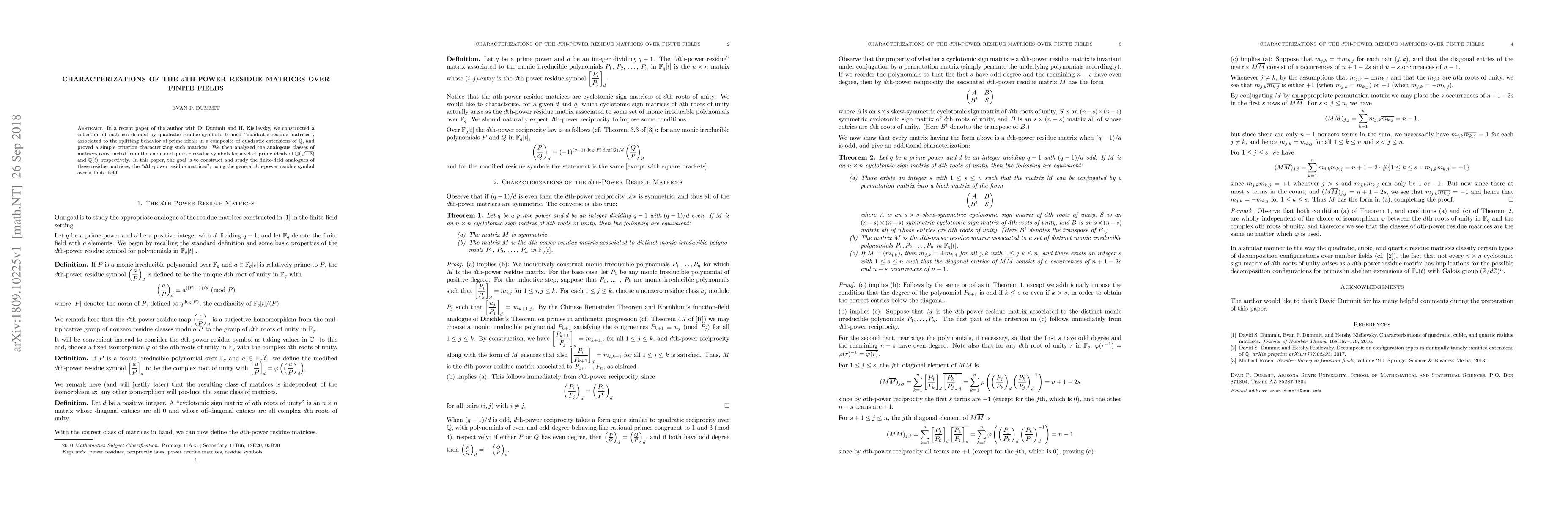In a recent paper of the author with D. Dummit and H. Kisilevsky, we constructed a collection of matrices defined by quadratic residue symbols, termed "quadratic residue matrices", associated to the splitting behavior of prime ideals in a composite of quadratic extensions of $\mathbb{Q}$, and proved a simple criterion characterizing such matrices. We then analyzed the analogous classes of matrices constructed from the cubic and quartic residue symbols for a set of prime ideals of $\mathbb{Q}(\sqrt{-3})$ and $\mathbb{Q}(i)$, respectively. In this paper, the goal is to construct and study the finite-field analogues of these residue matrices, the "$d$th-power residue matrices", using the general $d$th-power residue symbol over a finite field.