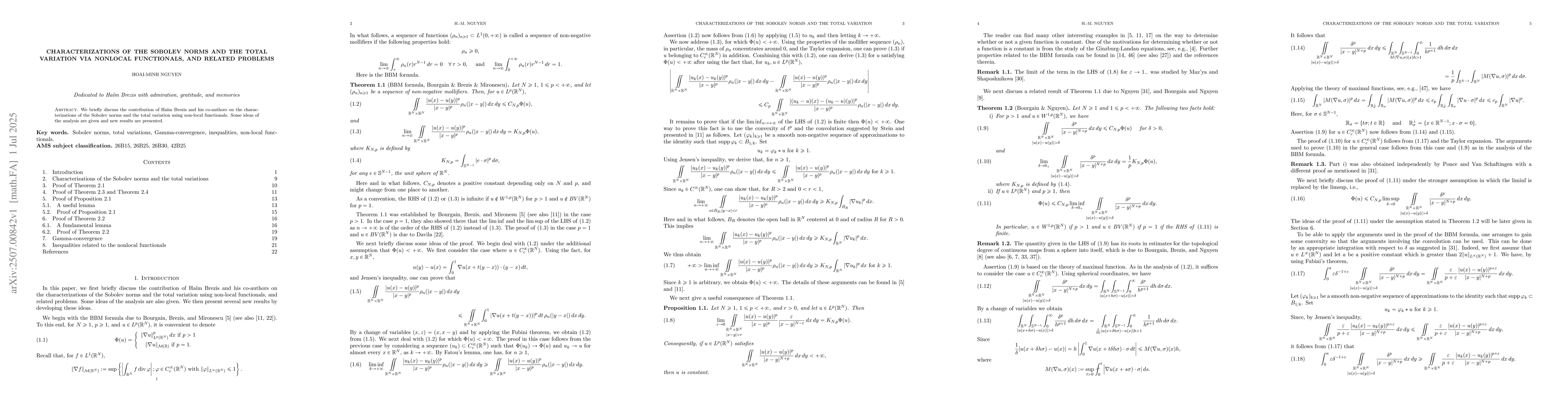 We briefly discuss the contribution of Ha\"im Brezis and his co-authors on the characterizations of the Sobolev norms and the total variation using non-local functionals. Some ideas of the analysis are given and new results are presented.
