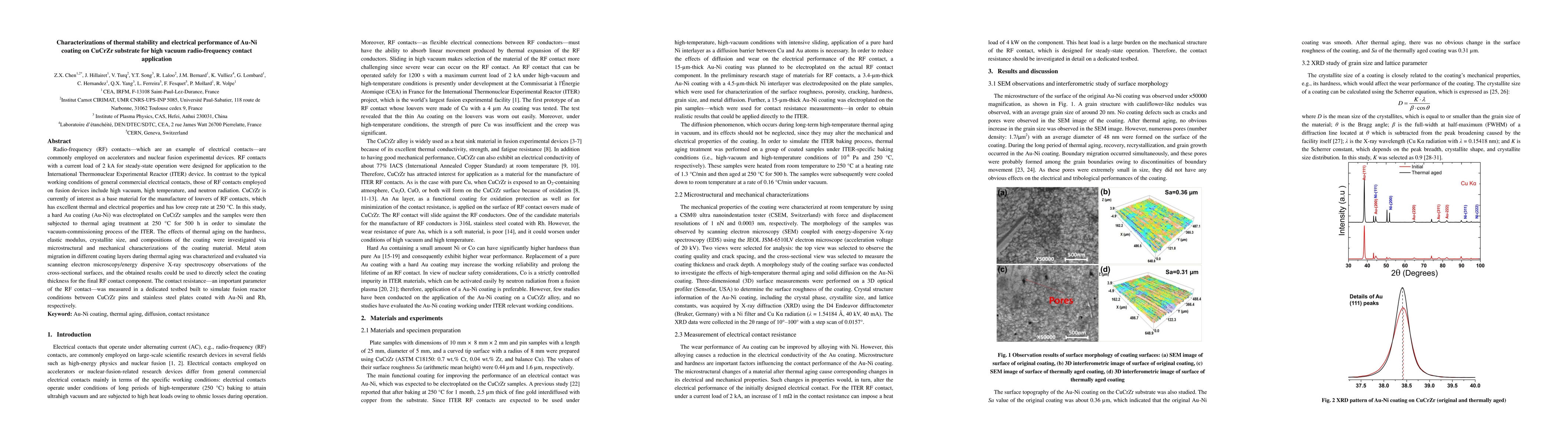 Radio-frequency (RF) contacts-which are an example of electrical contacts-are commonly employed on accelerators and nuclear fusion experimental devices. RF contacts with a current load of 2 kA for steady-state operation were designed for application to the International Thermonuclear Experimental Reactor (ITER) device. In contrast to the typical working conditions of general commercial electrical contacts, those of RF contacts employed on fusion devices include high vacuum, high temperature, and neutron radiation. CuCrZr is currently of interest as a base material for the manufacture of louvers of RF contacts, which has excellent thermal and electrical properties and has low creep rate at 250 {\textdegree}C. In this study, a hard Au coating (Au-Ni) was electroplated on CuCrZr samples and the samples were then subjected to thermal aging treatment at 250 {\textdegree}C for 500 h in order to simulate the vacuum-commissioning process of the ITER. The effects of thermal aging on the hardness, elastic modulus, crystallite size, and compositions of the coating were investigated via microstructural and mechanical characterizations of the coating material. Metal atom migration in different coating layers during thermal aging was characterized and evaluated via scanning electron microscopy/energy dispersive X-ray spectroscopy observations of the cross-sectional surfaces, and the obtained results could be used to directly select the coating thickness for the final RF contact component. The contact resistance-an important parameter of the RF contact-was measured in a dedicated testbed built to simulate fusion reactor conditions between CuCrZr pins and stainless steel plates coated with Au-Ni and Rh, respectively.