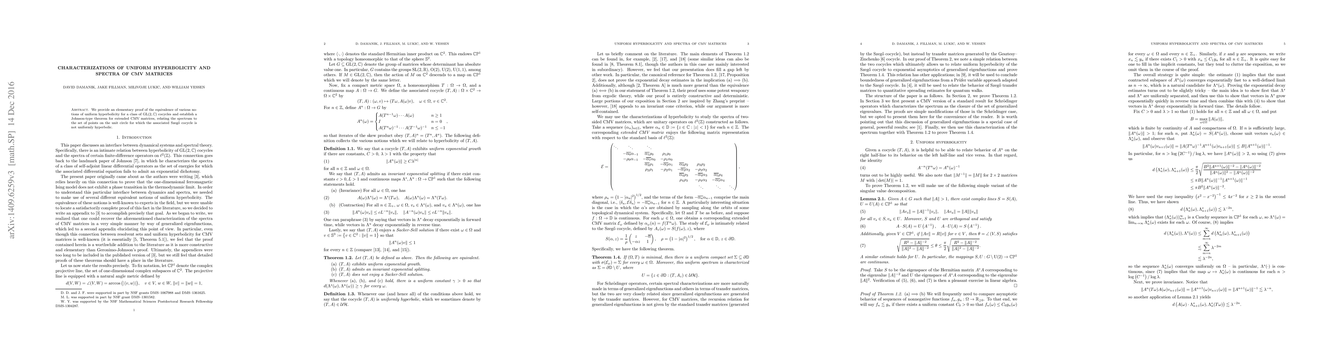 This paper proves the equivalence of different definitions of uniform hyperbolicity for $\mathrm{GL}(2,\mathbb{C})$ cocycles and establishes a Johnson-type theorem for extended CMV matrices, linking their spectra to points on the unit circle where the associated Szegő cocycle fails to be uniformly hyperbolic.