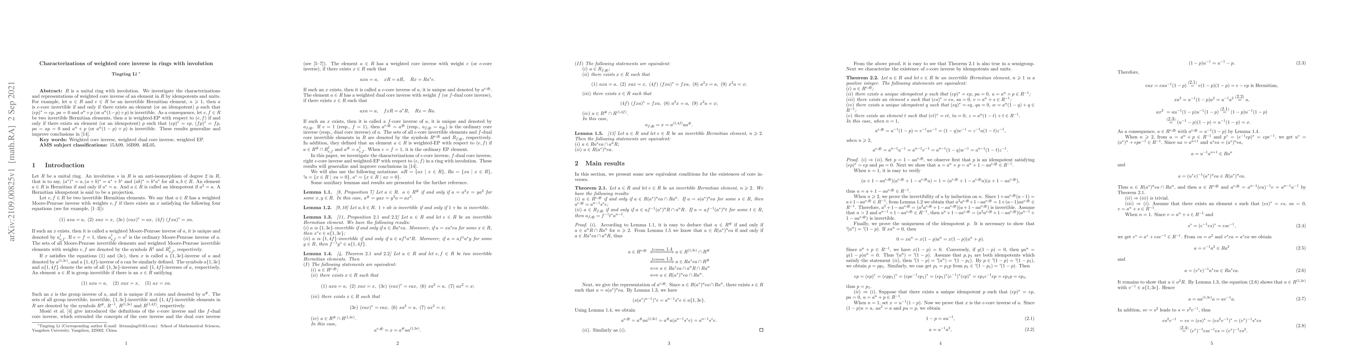 $R$ is a unital ring with involution. We investigate the characterizations and representations of weighted core inverse of an element in $R$ by idempotents and units. For example, let $a\in R$ and $e\in R$ be an invertible Hermitian element, $n\geqslant 1$, then $a$ is $e$-core invertible if and only if there exists an element (or an idempotent) $p$ such that $(ep)^{\ast}=ep$, $pa=0$ and $a^{n}+p$ (or $a^{n}(1-p)+p$) is invertible. As a consequence, let $e, f\in R$ be two invertible Hermitian elements, then $a$ is weighted-$\mathrm{EP}$ with respect to $(e, f)$ if and only if there exists an element (or an idempotent) $p$ such that $(ep)^{\ast}=ep$, $(fp)^{\ast}=fp$, $pa=ap=0$ and $a^{n}+p$ (or $a^{n}(1-p)+p$) is invertible. These results generalize and improve conclusions in \cite{Li}.