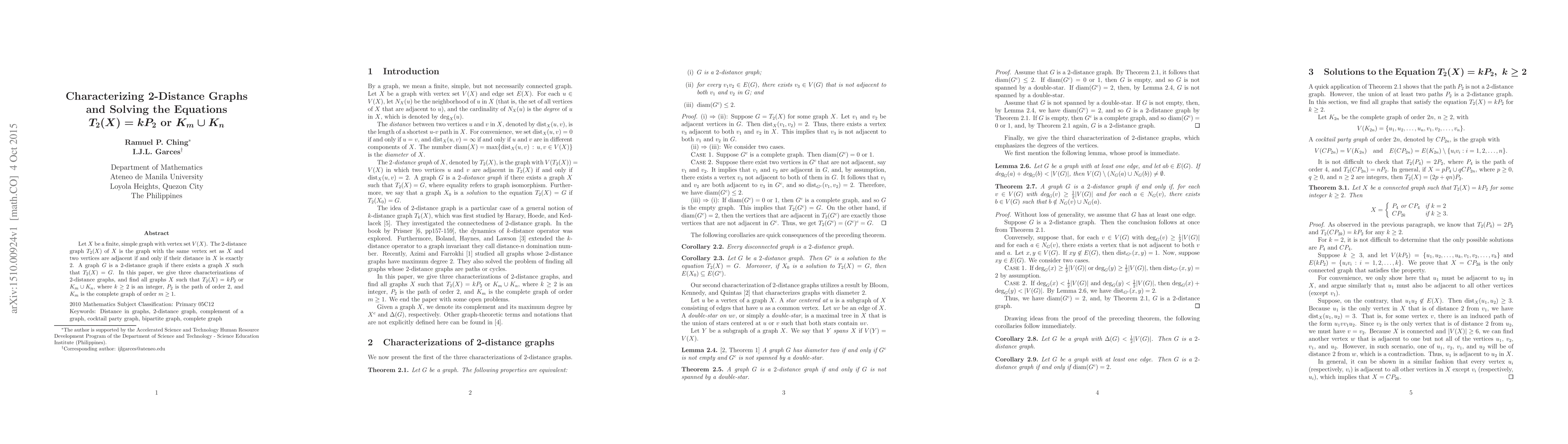Let $X$ be a finite, simple graph with vertex set $V(X)$. The $2$-distance graph $T_2(X)$ of $X$ is the graph with the same vertex set as $X$ and two vertices are adjacent if and only if their distance in $X$ is exactly $2$. A graph $G$ is a $2$-distance graph if there exists a graph $X$ such that $T_2(X)=G$. In this paper, we give three characterizations of $2$-distance graphs, and find all graphs $X$ such that $T_2(X)=kP_2$ or $K_m \cup K_n$, where $k \ge 2$ is an integer, $P_2$ is the path of order $2$, and $K_m$ is the complete graph of order $m \ge 1$.