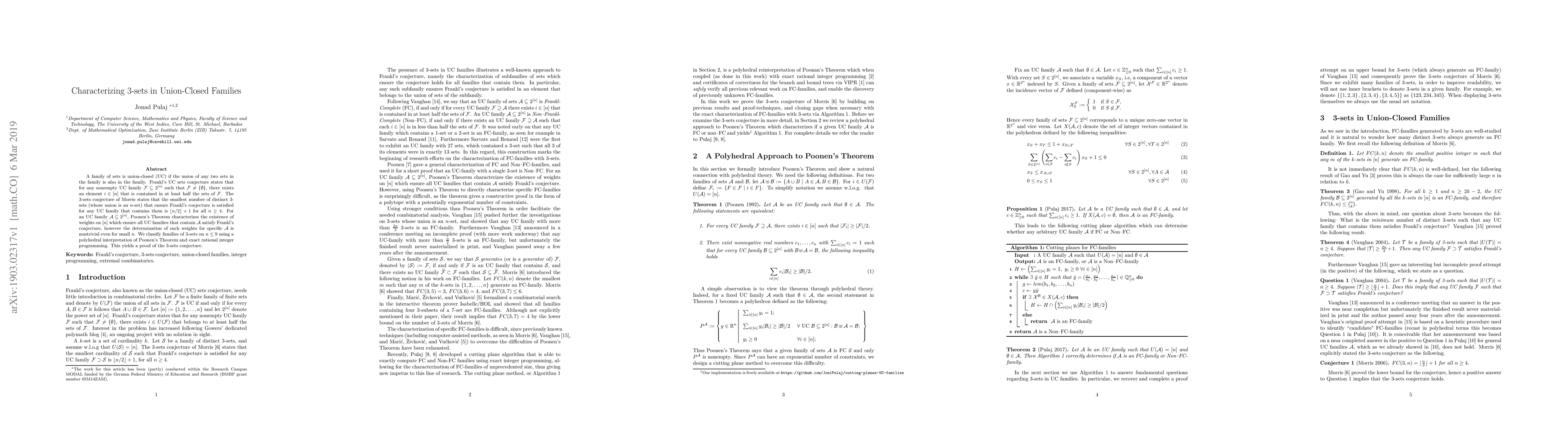 The paper proves Morris's 3-sets conjecture by classifying union-closed families of 3-sets on $n \leq 9$ through a polyhedral interpretation of Poonen's Theorem and exact rational integer programming. This classification confirms that $\lfloor{n/2\rfloor} + 1$ distinct 3-sets are sufficient to satisfy Frankl's conjecture for any union-closed family containing them.