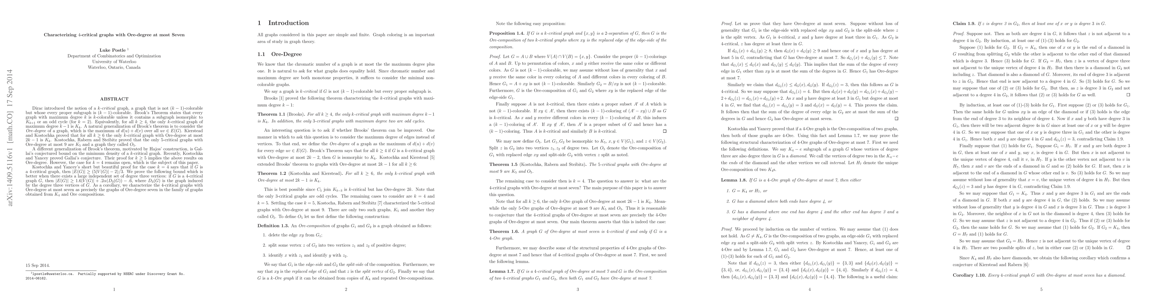 This paper focuses on 4-critical graphs with Ore-degree at most seven, building on previous work by Kostochka, Kierstead, Kostochka, Rabern, Steibitz, and Kostochka & Yancey. It improves upon existing bounds for such graphs, providing a new characterization. The key finding is a refined edge density inequality for 4-critical graphs, which is particularly effective for graphs with large independent sets of degree-three vertices. The proof technique involves combinatorial arguments and graph theory, ultimately showing that 4-critical graphs of Ore-degree at most seven fall within a specific family derived from K_4 and Ore compositions.