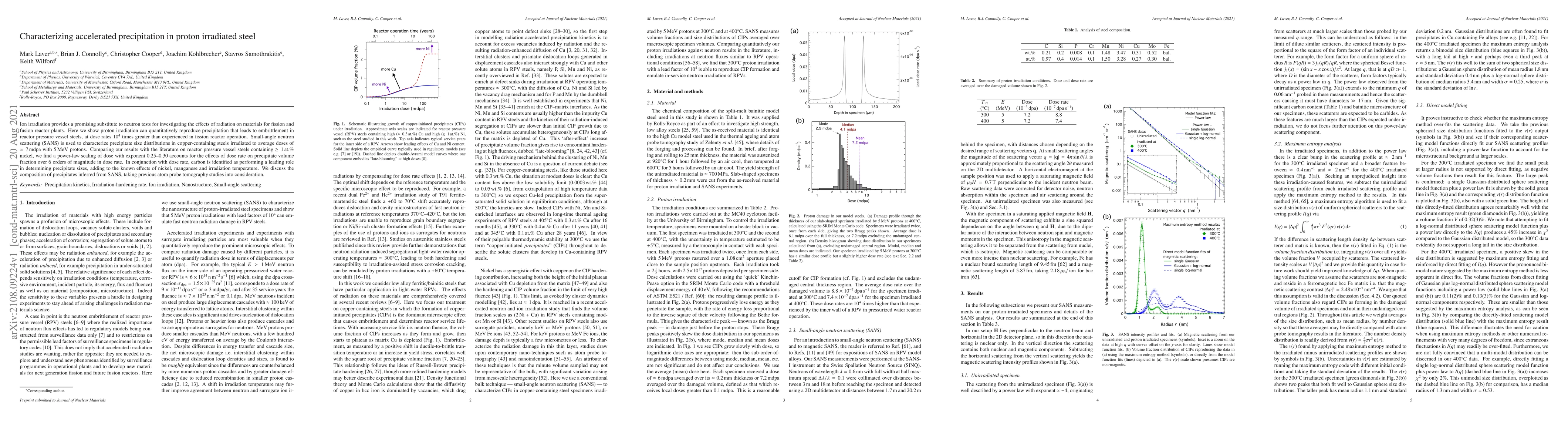 This study demonstrates that proton irradiation can replicate radiation-induced precipitation in steel, leading to embrittlement, at accelerated dose rates. Small-angle neutron scattering reveals that carbon, along with nickel, manganese, and temperature, significantly influences precipitate size, with a power-law scaling relating dose rate to precipitate volume fraction.