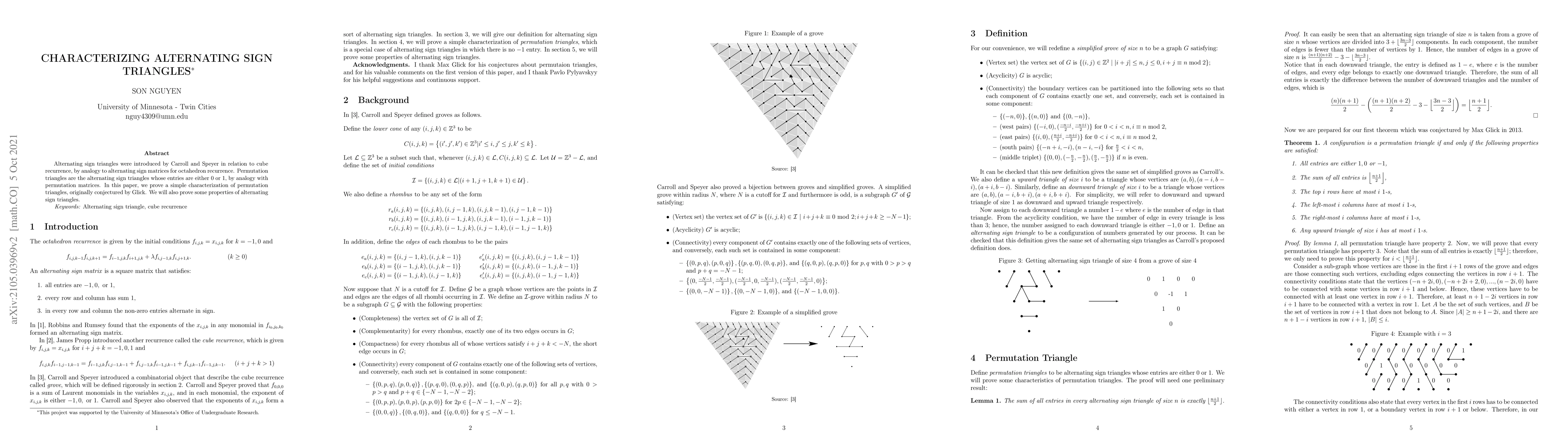 Alternating sign triangles were introduced by Carroll and Speyer in relation to cube recurrence, by analogy to alternating sign matrices for octahedron recurrence. Permutation triangles are the alternating sign triangles whose entries are either 0 or 1, by analogy with permutation matrices. In this paper, we prove a simple characterization of permutation triangles, originally conjectured by Glick. We will also prove some properties of alternating sign triangles.