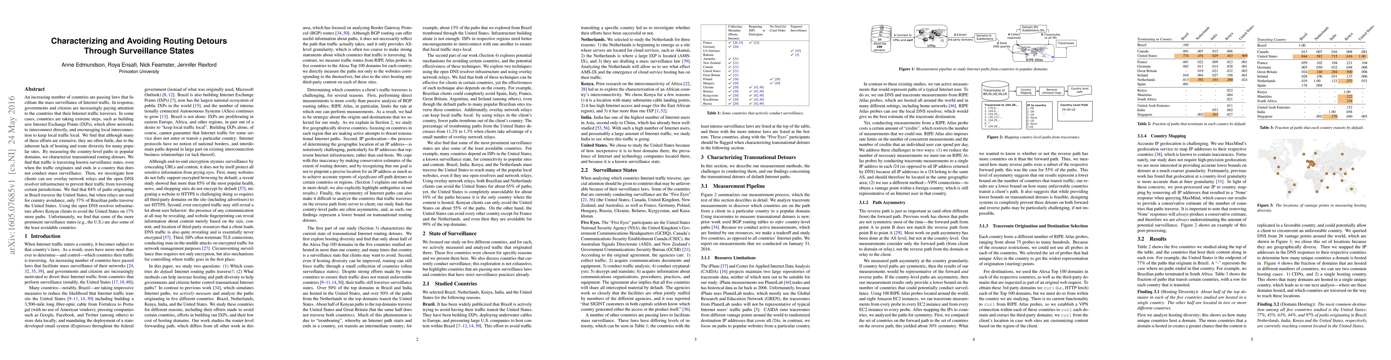 This paper characterizes routing detours through surveillance states and explores methods to avoid them. It finds that despite efforts to keep traffic local, many paths still traverse known surveillance states, but using overlay network relays and open DNS resolvers can significantly reduce the occurrence of such detours.
