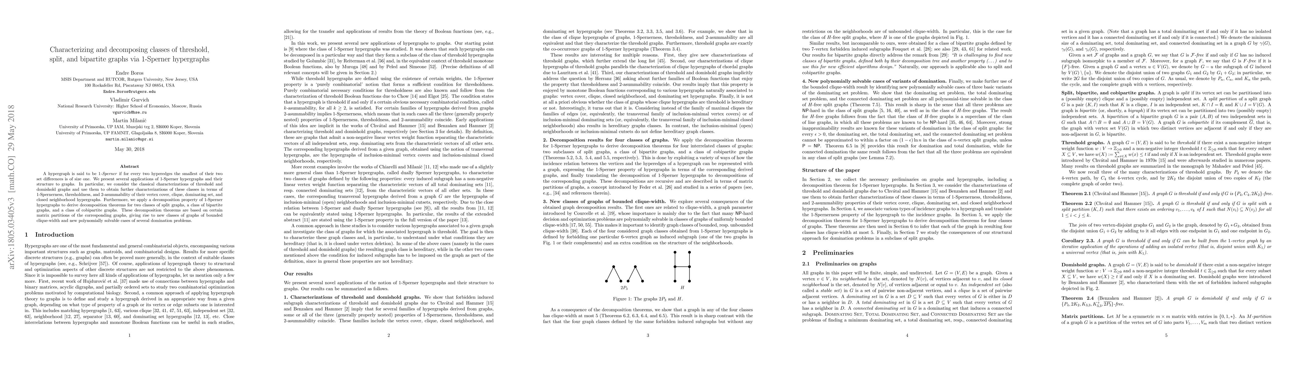This paper explores the application of $1$-Sperner hypergraphs to characterize and decompose threshold, split, and bipartite graphs, providing new insights into their structural properties and leading to the discovery of new classes of graphs with bounded clique-width and polynomially solvable domination problems.