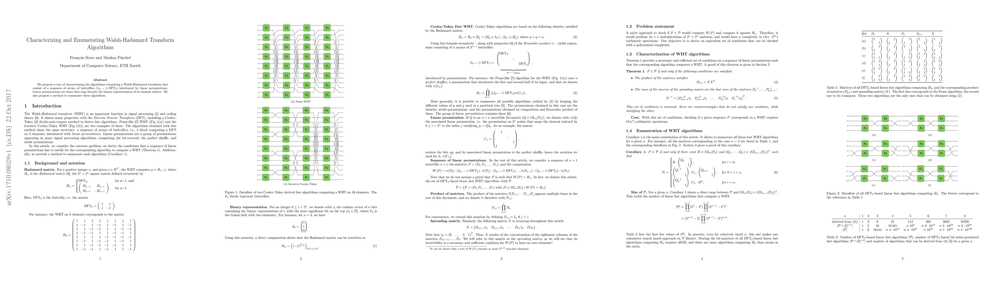 This paper characterizes algorithms computing Walsh-Hadamard transforms through sequences of butterfly arrays and linear permutations, and introduces a method for enumerating these algorithms.