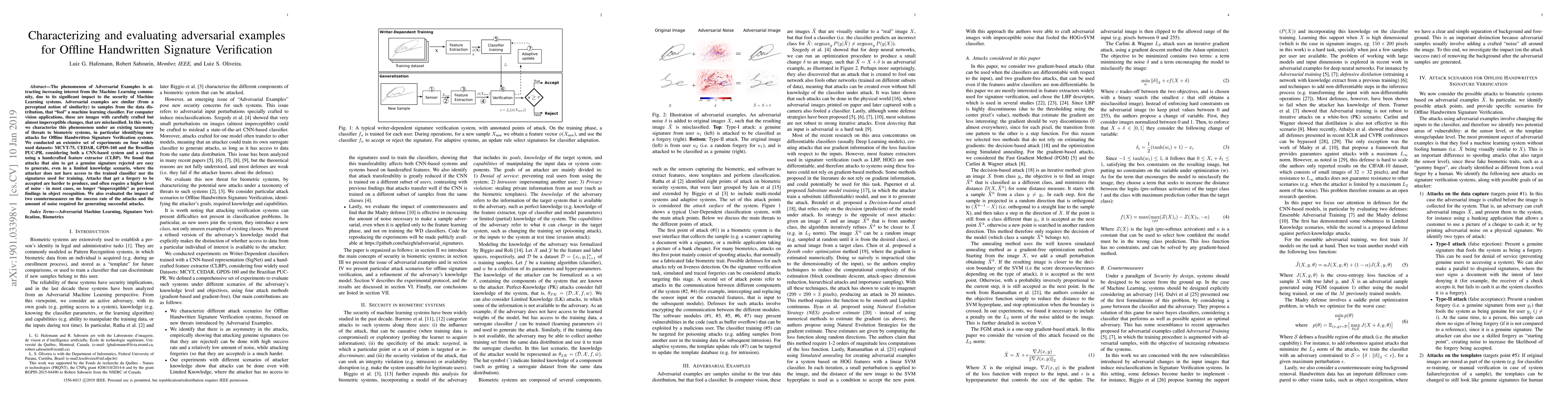 This paper characterizes adversarial examples for Offline Handwritten Signature Verification, identifying new attack methods and evaluating their effectiveness against both CNN-based and handcrafted feature extractor systems. It finds that attacks to reject genuine signatures are easily generated, while attacks to accept forgeries require more noise and are harder to produce.