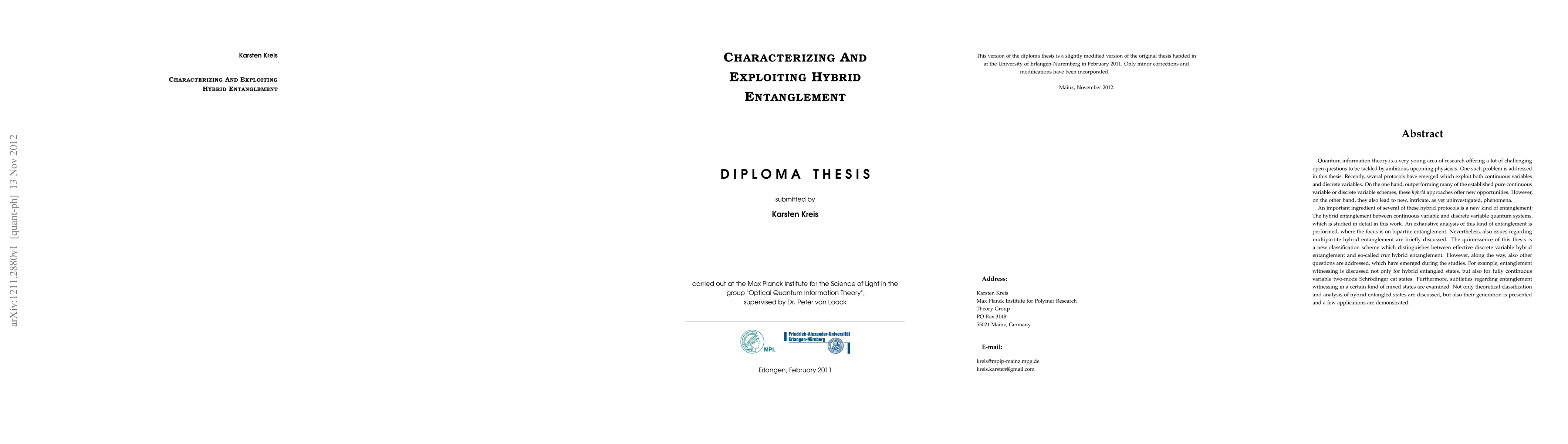 Quantum information theory is a very young area of research offering a lot of challenging open questions to be tackled by ambitious upcoming physicists. One such problem is addressed in this thesis. Recently, several protocols have emerged which exploit both continuous variables and discrete variables. On the one hand, outperforming many of the established pure continuous variable or discrete variable schemes, these hybrid approaches offer new opportunities. However, on the other hand, they also lead to new, intricate, as yet uninvestigated, phenomena. An important ingredient of several of these hybrid protocols is a new kind of entanglement: The hybrid entanglement between continuous variable and discrete variable quantum systems, which is studied in detail in this work. An exhaustive analysis of this kind of entanglement is performed, where the focus is on bipartite entanglement. Nevertheless, also issues regarding multipartite hybrid entanglement are briefly discussed. The quintessence of this thesis is a new classification scheme which distinguishes between effective discrete variable hybrid entanglement and so-called true hybrid entanglement. However, along the way, also other questions are addressed, which have emerged during the studies. For example, entanglement witnessing is discussed not only for hybrid entangled states, but also for fully continuous variable two-mode Schroedinger cat states. Furthermore, subtleties regarding entanglement witnessing in a certain kind of mixed states are examined. Not only theoretical classification and analysis of hybrid entangled states are discussed, but also their generation is presented and a few applications are demonstrated.