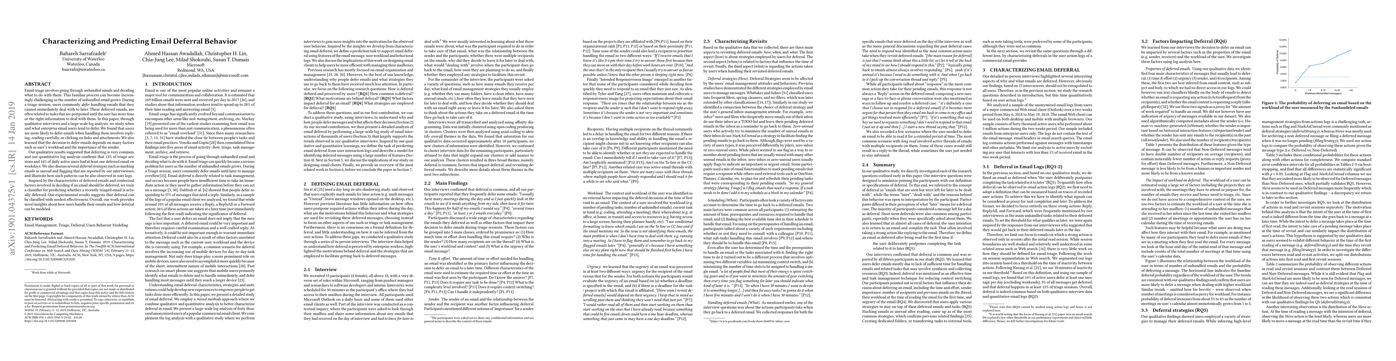 This paper investigates email deferral behavior in enterprise settings through interviews and log analysis, revealing that deferrals often occur when emails require careful handling. It develops a classifier to predict deferrals based on user workload and email context, showing moderate success in identifying deferred emails.