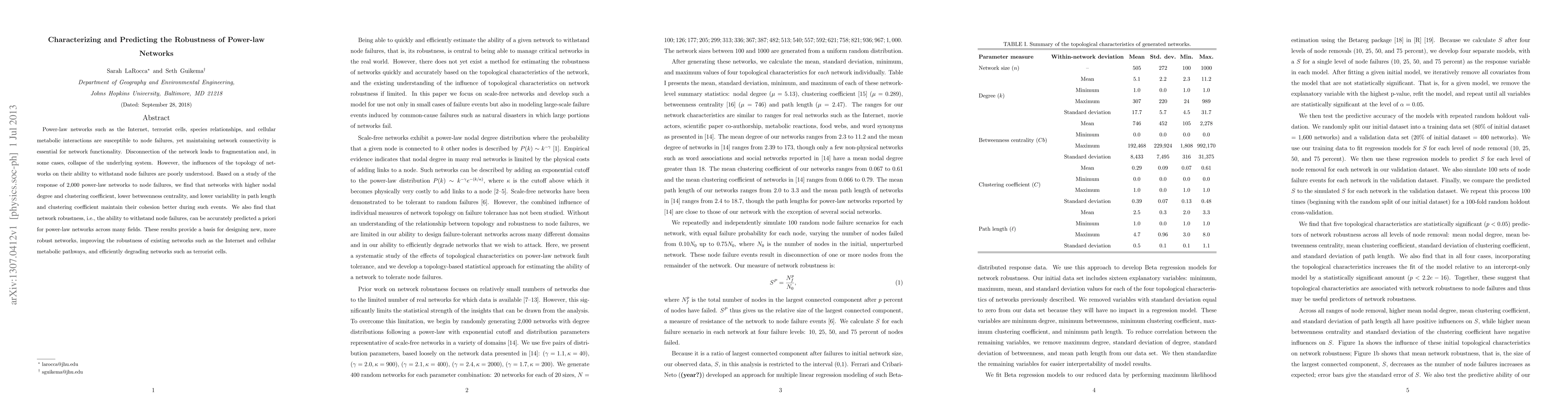 Researchers found that power-law networks with higher nodal degree, clustering coefficient, lower betweenness centrality, and less variability in path length can withstand node failures better. These findings provide a basis for designing more robust networks.