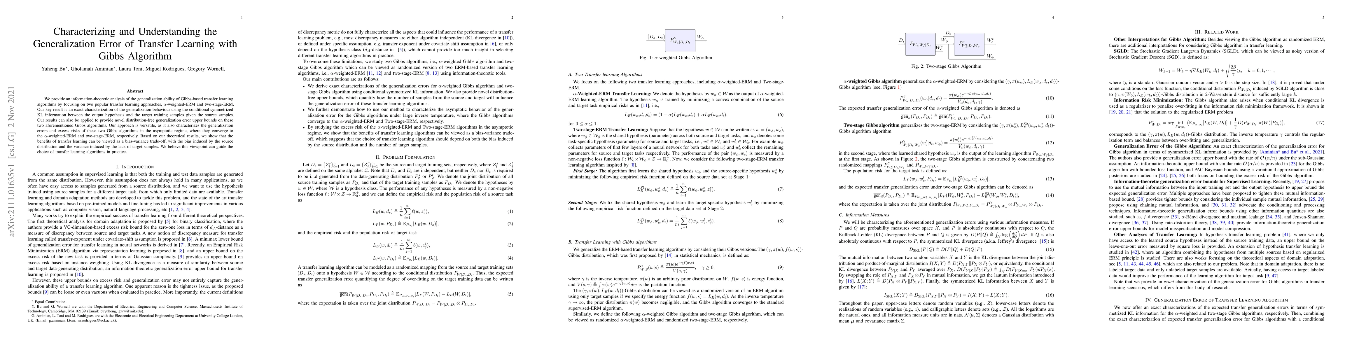 This paper provides an information-theoretic analysis of Gibbs-based transfer learning algorithms, characterizing their generalization behavior and deriving novel distribution-free error bounds. It reveals a bias-variance trade-off in transfer learning, guiding practical algorithm selection.