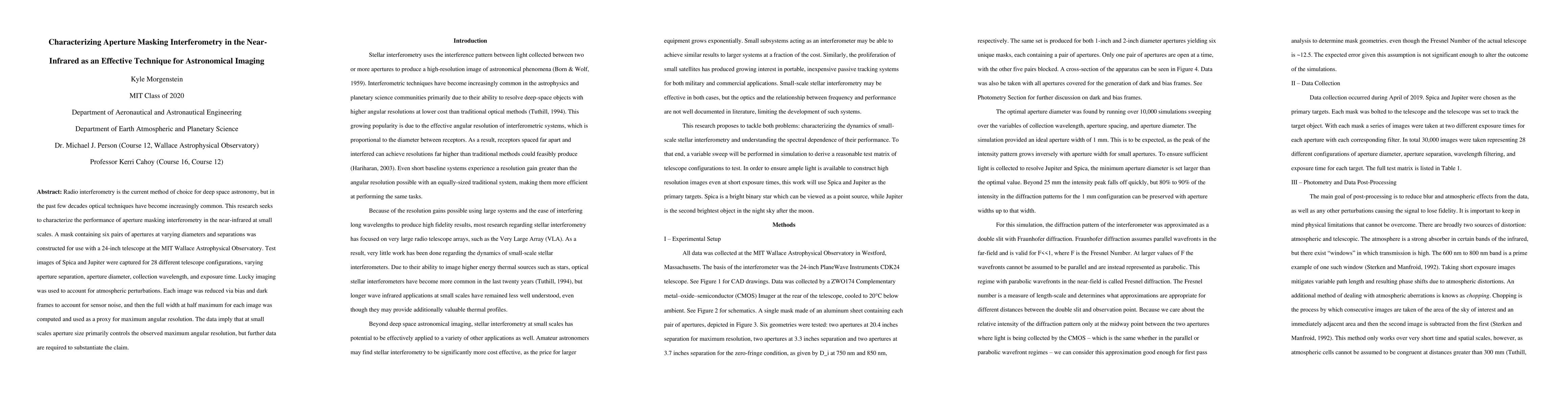 This research characterizes aperture masking interferometry in near-infrared astronomy using a 24-inch telescope. Test images of Spica and Jupiter, processed with lucky imaging, indicate that aperture size mainly influences small-scale resolution, though more data is needed to confirm.