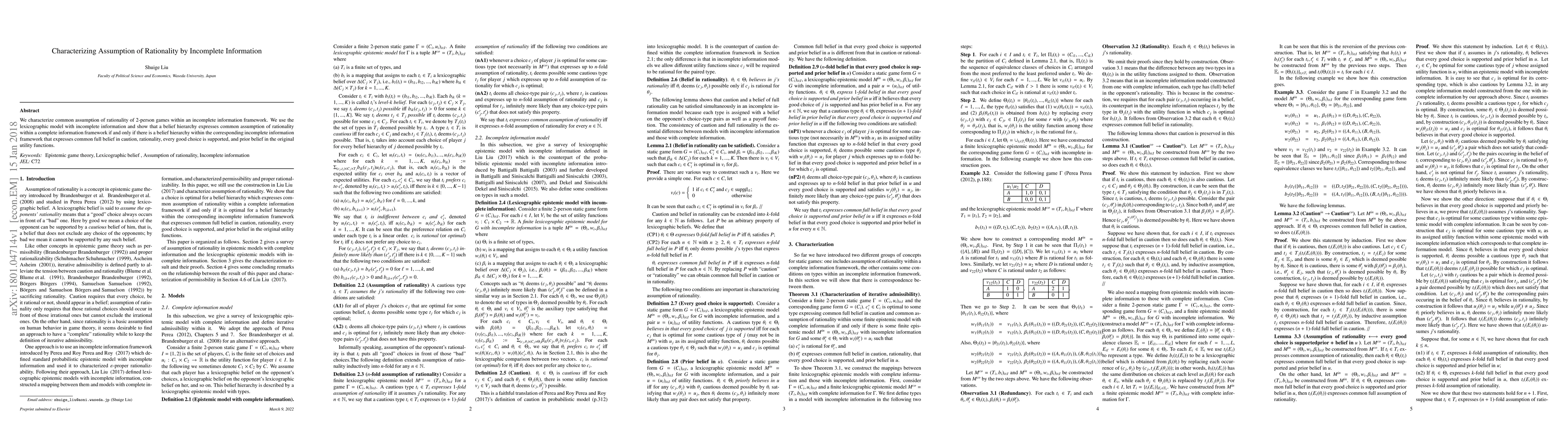 This paper characterizes the rationality assumption in 2-person games under incomplete information using a lexicographic model, demonstrating that it aligns with a complete information framework if and only if a belief hierarchy in the incomplete framework supports full belief in caution, rationality, every good choice, and prior utility functions.