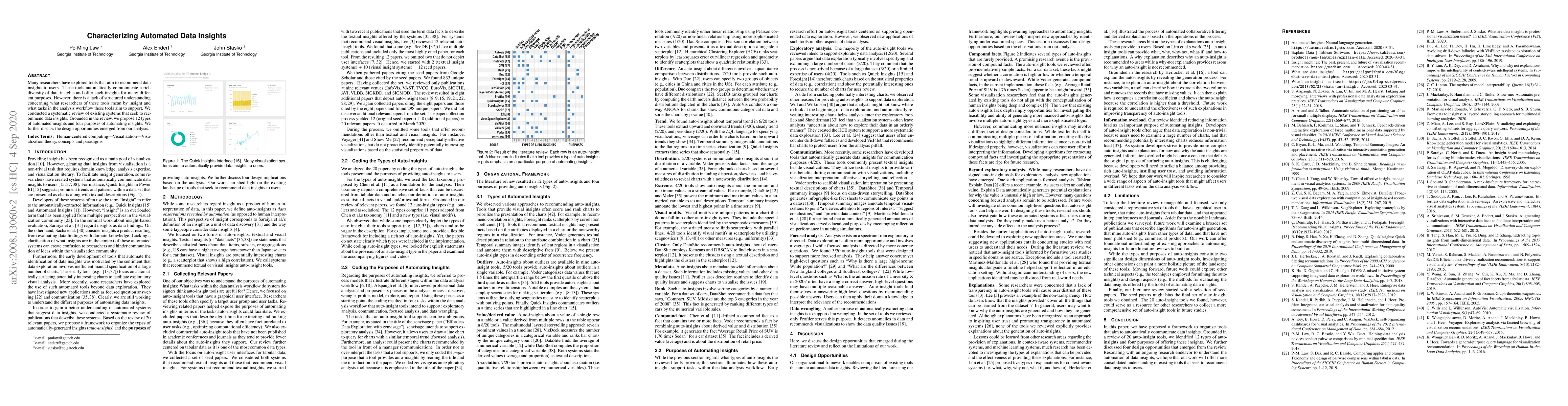 Many researchers have explored tools that aim to recommend data insights to users. These tools automatically communicate a rich diversity of data insights and offer such insights for many different purposes. However, there is a lack of structured understanding concerning what researchers of these tools mean by "insight" and what tasks in the analysis workflow these tools aim to support. We conducted a systematic review of existing systems that seek to recommend data insights. Grounded in the review, we propose 12 types of automated insights and four purposes of automating insights. We further discuss the design opportunities emerged from our analysis.