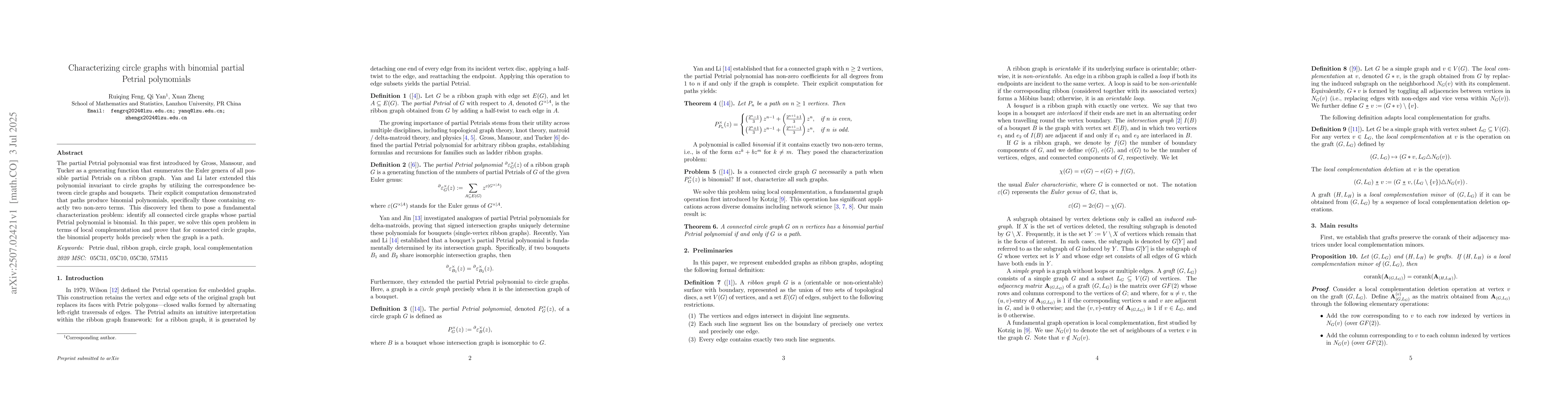 The partial Petrial polynomial was first introduced by Gross, Mansour, and Tucker as a generating function that enumerates the Euler genera of all possible partial Petrials on a ribbon graph. Yan and Li later extended this polynomial invariant to circle graphs by utilizing the correspondence between circle graphs and bouquets. Their explicit computation demonstrated that paths produce binomial polynomials, specifically those containing exactly two non-zero terms. This discovery led them to pose a fundamental characterization problem: identify all connected circle graphs whose partial Petrial polynomial is binomial. In this paper, we solve this open problem in terms of local complementation and prove that for connected circle graphs, the binomial property holds precisely when the graph is a path.