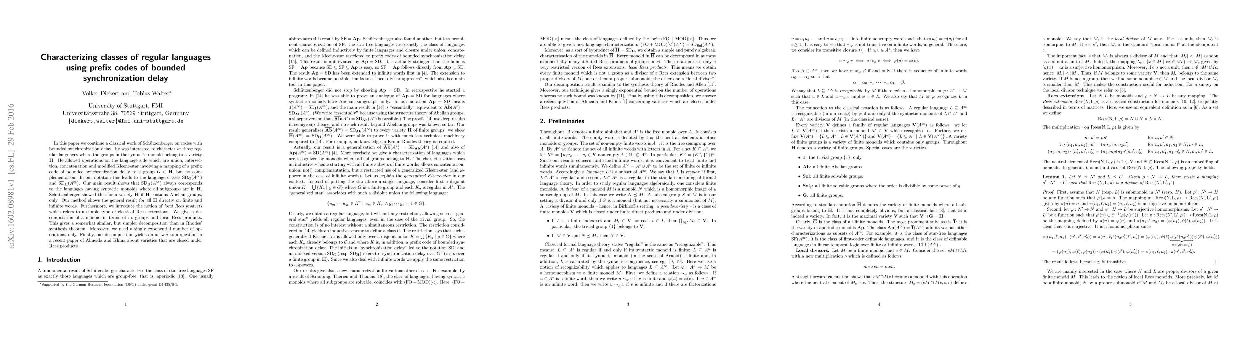 In this paper we continue a classical work of Sch\"utzenberger on codes with bounded synchronization delay. He was interested to characterize those regular languages where the groups in the syntactic monoid belong to a variety $H$. He allowed operations on the language side which are union, intersection, concatenation and modified Kleene-star involving a mapping of a prefix code of bounded synchronization delay to a group $G\in H$, but no complementation. In our notation this leads to the language classes $SD_G(A^\infty)$ and $SD_H(A^\infty$). Our main result shows that $SD_H(A^\infty)$ always corresponds to the languages having syntactic monoids where all subgroups are in $H$. Sch\"utzenberger showed this for a variety $H$ if $H$ contains Abelian groups, only. Our method shows the general result for all $H$ directly on finite and infinite words. Furthermore, we introduce the notion of local Rees products which refers to a simple type of classical Rees extensions. We give a decomposition of a monoid in terms of its groups and local Rees products. This gives a somewhat similar, but simpler decomposition than in Rhodes' synthesis theorem. Moreover, we need a singly exponential number of operations, only. Finally, our decomposition yields an answer to a question in a recent paper of Almeida and Kl\'ima about varieties that are closed under Rees products.