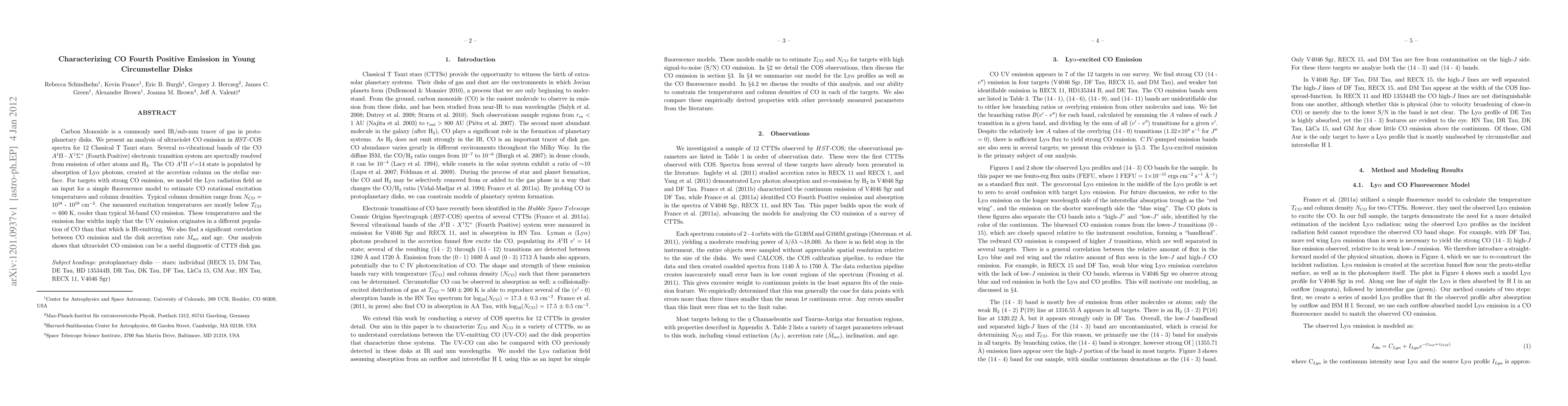 Carbon Monoxide is a commonly used IR/sub-mm tracer of gas in protoplanetary disks. We present an analysis of ultraviolet CO emission in {HST}-COS spectra for 12 Classical T Tauri stars. Several ro-vibrational bands of the CO A^1\Pi - X^1\Sigma^+ (Fourth Positive) electronic transition system are spectrally resolved from emission of other atoms and H_2. The CO A^1\Pi v'=14 state is populated by absorption of Ly\alpha photons, created at the accretion column on the stellar surface. For targets with strong CO emission, we model the Ly\alpha radiation field as an input for a simple fluorescence model to estimate CO rotational excitation temperatures and column densities. Typical column densities range from N_{CO} = 10^{18} - 10^{19} cm^{-2}. Our measured excitation temperatures are mostly below T_{CO} = 600 K, cooler than typical M-band CO emission. These temperatures and the emission line widths imply that the UV emission originates in a different population of CO than that which is IR-emitting. We also find a significant correlation between CO emission and the disk accretion rate M_{acc} and age. Our analysis shows that ultraviolet CO emission can be a useful diagnostic of CTTS disk gas.