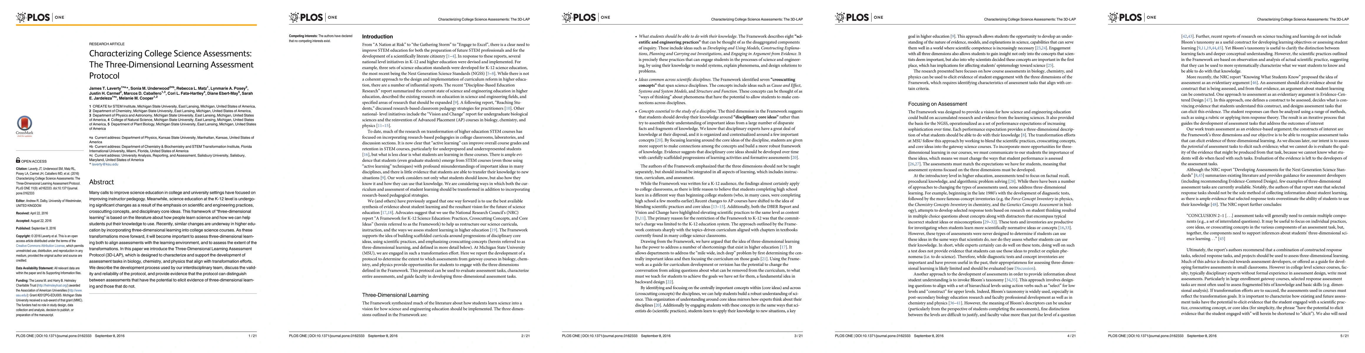 This paper introduces the Three-Dimensional Learning Assessment Protocol (3D-LAP) to evaluate college science assessments aligned with the new framework of three-dimensional learning, emphasizing scientific practices, crosscutting concepts, and core ideas. The protocol aims to support the development of assessments in biology, chemistry, and physics that reflect these transformations and demonstrates its validity and reliability.