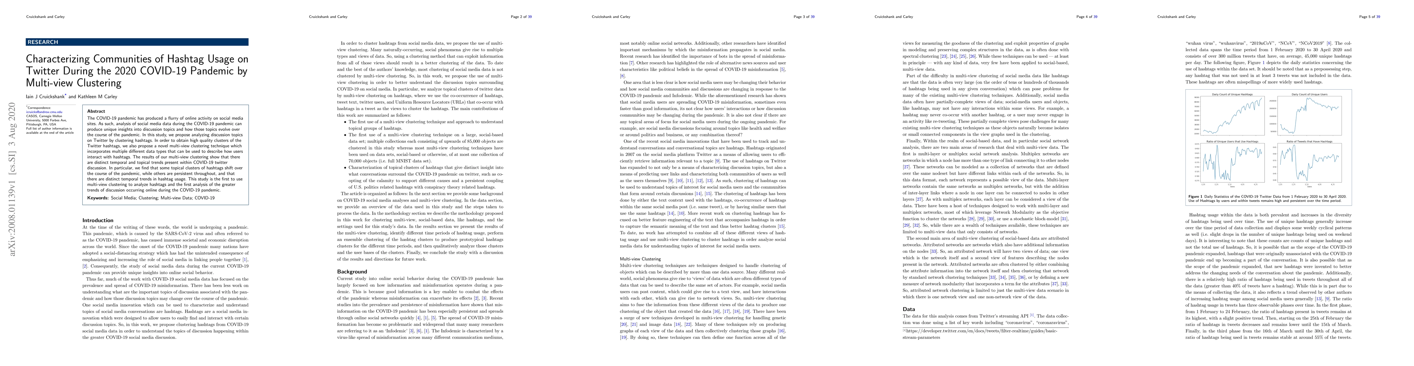 This study employs multi-view clustering to analyze Twitter hashtags during the 2020 COVID-19 pandemic, revealing distinct temporal and topical trends in online discussions. The findings highlight shifting and persistent topical clusters, providing unique insights into the evolution of social media discourse during the pandemic.