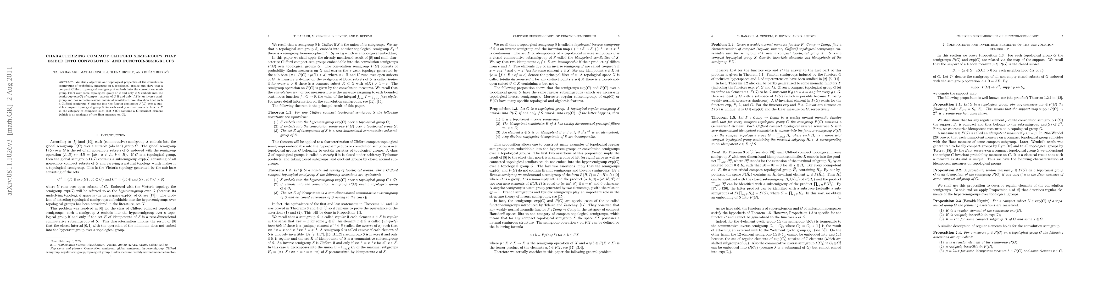 We study algebraic and topological properties of the convolution semigroups of probability measures on a topological groups and show that a compact Clifford topological semigroup $S$ embeds into the convolution semigroup $P(G)$ over some topological group $G$ if and only if $S$ embeds into the semigroup $\exp(G)$ of compact subsets of $G$ if and only if $S$ is an inverse semigroup and has zero-dimensional maximal semilattice. We also show that such a Clifford semigroup $S$ embeds into the functor-semigroup $F(G)$ over a suitable compact topological group $G$ for each weakly normal monadic functor $F$ in the category of compacta such that $F(G)$ contains a $G$-invariant element (which is an analogue of the Haar measure on $G$).
