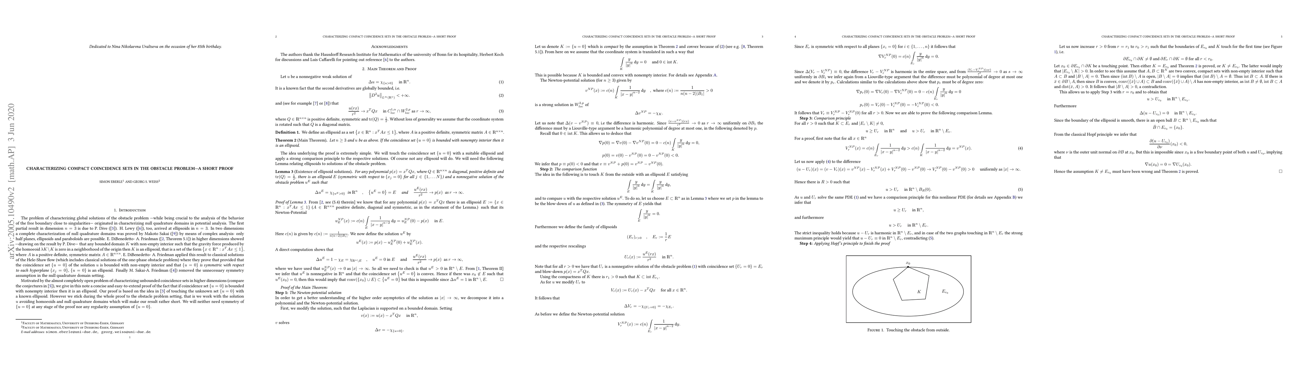 This paper provides a concise proof that if the coincidence set $\{u=0\}$ of a global solution $u$ in the classical obstacle problem is bounded with nonempty interior, then it must be an ellipsoid. The work addresses a longstanding open problem regarding the characterization of such sets in higher dimensions.