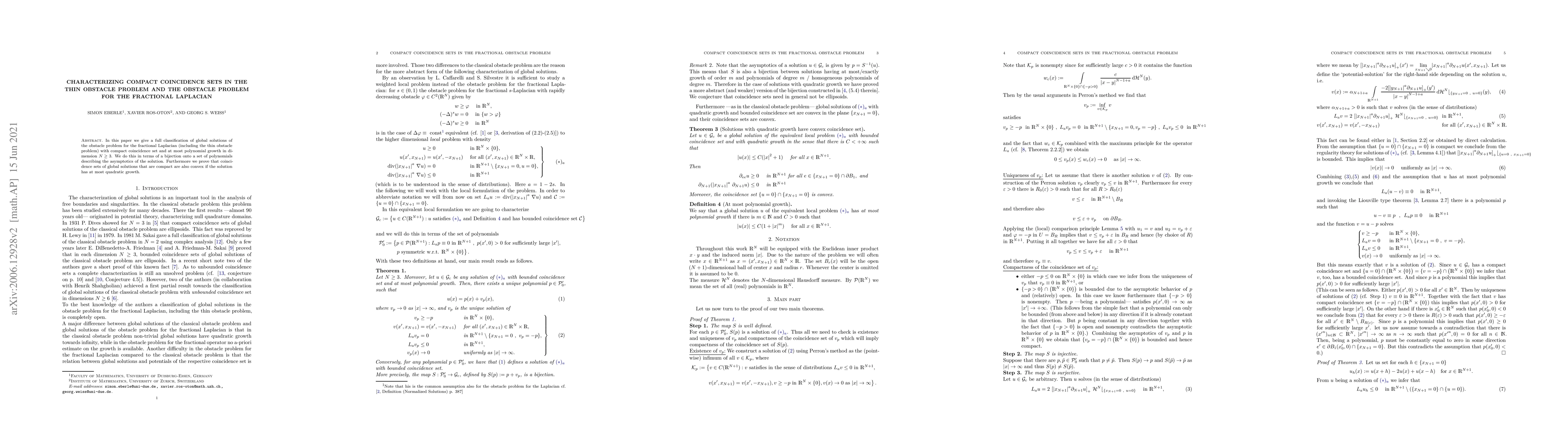 This paper classifies global solutions of the fractional Laplacian obstacle problem with compact coincidence sets, showing a bijection to polynomials describing solution asymptotics. It also proves that compact coincidence sets are convex if the solution has at most quadratic growth.