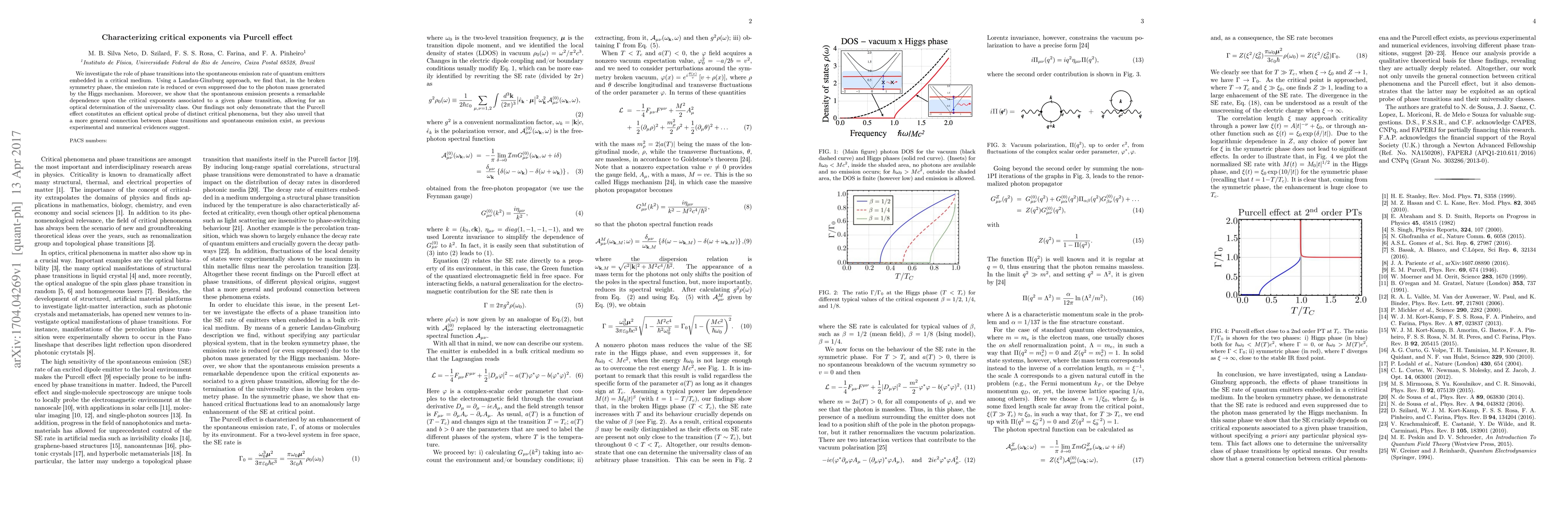 We investigate the role of phase transitions into the spontaneous emission rate of quantum emitters embedded in a critical medium. Using a Landau-Ginzburg approach, we find that, in the broken symmetry phase, the emission rate is reduced or even suppressed due to the photon mass generated by the Higgs mechanism. Moreover, we show that the spontaneous emission presents a remarkable dependence upon the critical exponents associated to a given phase transition, allowing for an optical determination of the universality class. Our findings not only demonstrate that the Purcell effect constitutes an efficient optical probe of distinct critical phenomena, but they also unveil that a more general connection between phase transitions and spontaneous emission exist, as previous experimental and numerical evidences suggest.