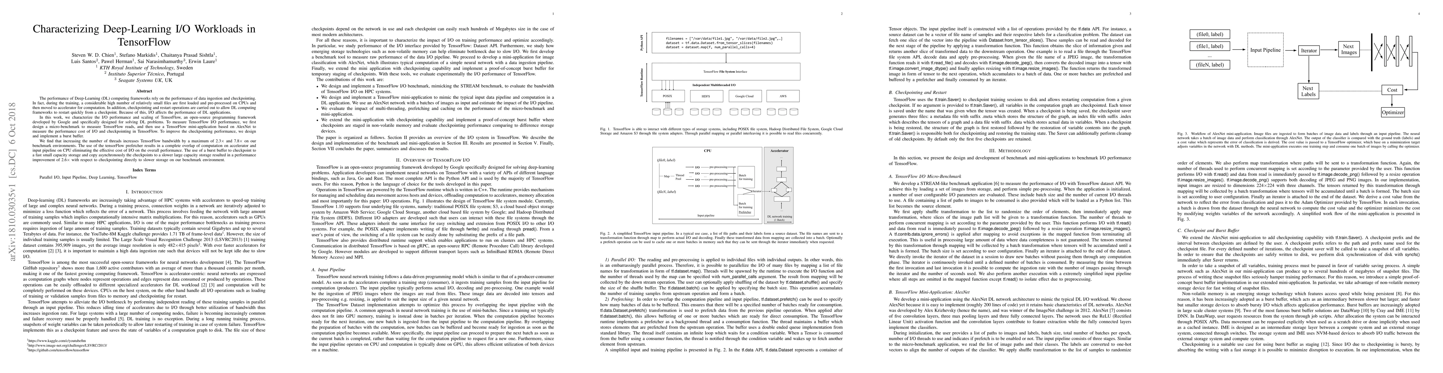 This paper characterizes the I/O performance and scaling of TensorFlow, focusing on data ingestion and checkpointing. It finds that TensorFlow I/O performance can be improved by increasing the number of threads and using a prefetcher to overlap computation and input pipeline, while a burst buffer enhances checkpointing efficiency by a factor of 2.6.