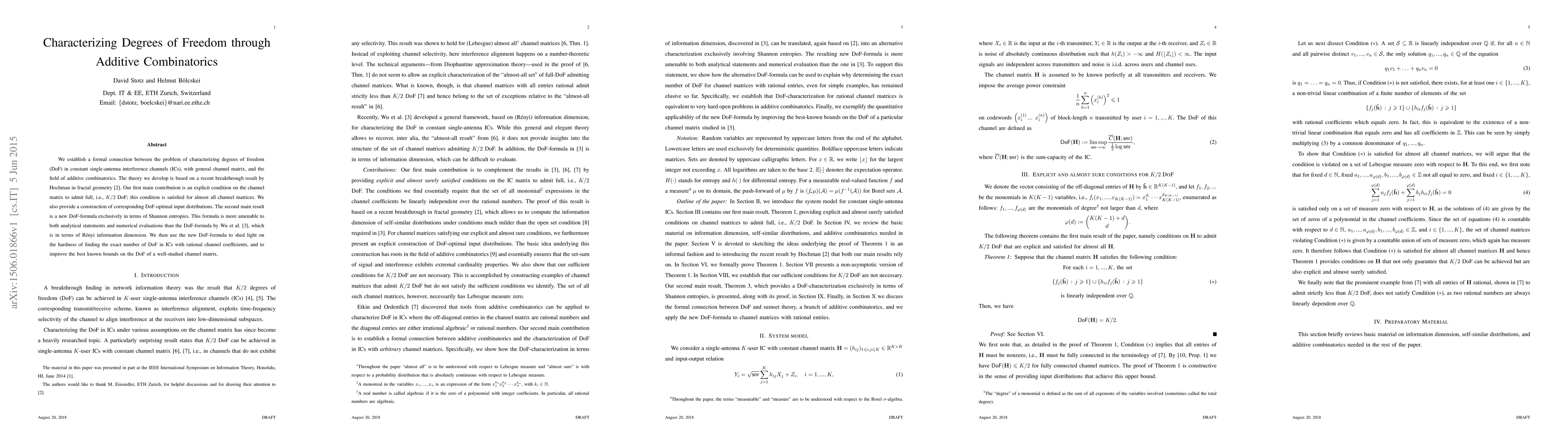 This research connects degrees of freedom (DoF) in complex communication channels to additive combinatorics, using a fractal geometry result. It presents a condition for full DoF, applicable to almost all channel matrices, and a new DoF formula based on Shannon entropies. The study also enhances bounds for a specific channel matrix and explores the challenge of exact DoF determination in rational coefficient channels.