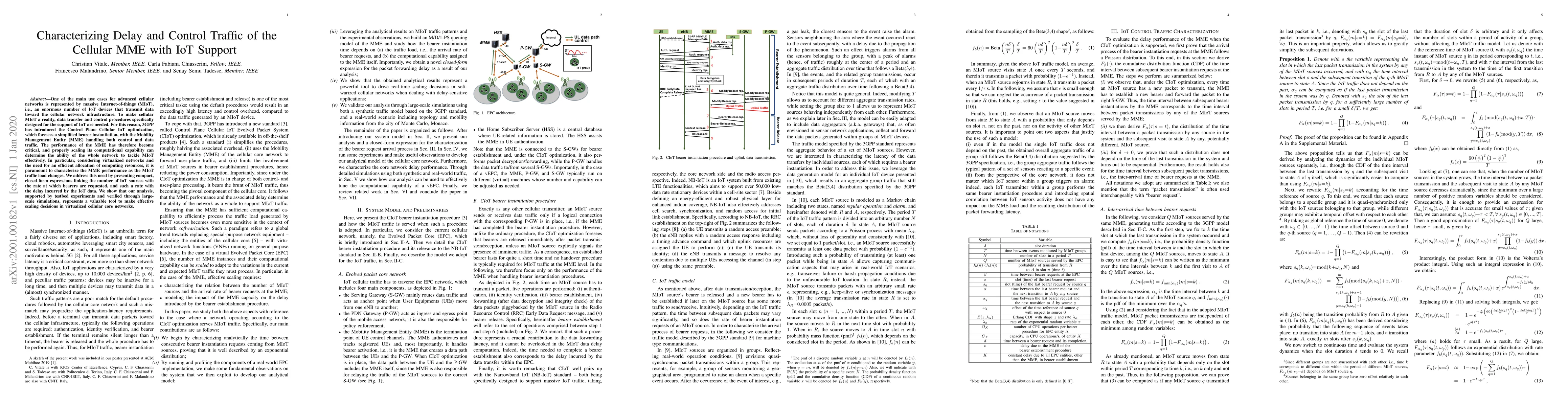 This paper characterizes the delay and control traffic of the Mobility Management Entity (MME) in cellular networks supporting massive Internet of Things (MIoT). It presents closed-form expressions linking IoT device traffic to bearer request rates and delay, providing insights for scaling MME performance in virtualized networks.