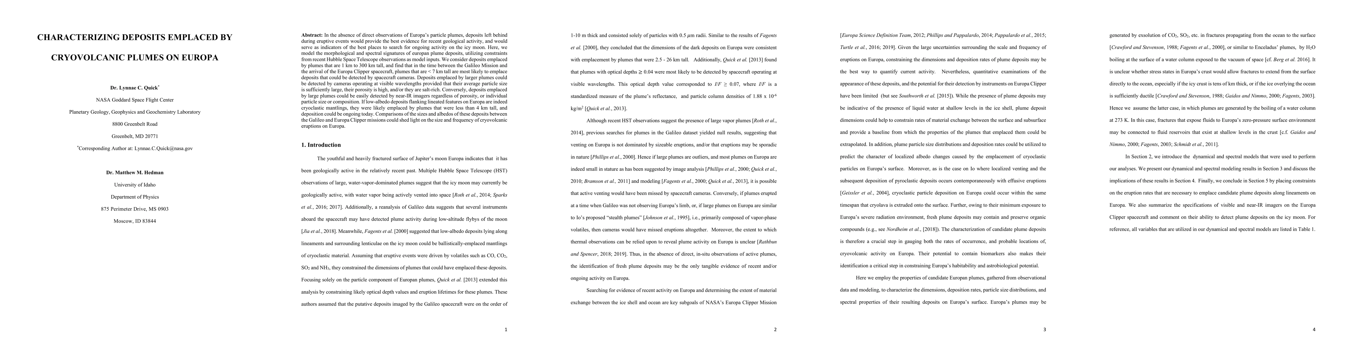 In the absence of direct observations of Europa's particle plumes, deposits left behind during eruptive events would provide the best evidence for recent geological activity, and would serve as indicators of the best places to search for ongoing activity on the icy moon. Here, we model the morphological and spectral signatures of europan plume deposits, utilizing constraints from recent Hubble Space Telescope observations as model inputs. We consider deposits emplaced by plumes that are 1 km to 300 km tall, and find that in the time between the Galileo Mission and the arrival of the Europa Clipper spacecraft, plumes that are < 7 km tall are most likely to emplace deposits that could be detected by spacecraft cameras. Deposits emplaced by larger plumes could be detected by cameras operating at visible wavelengths provided that their average particle size is sufficiently large, their porosity is high, and/or they are salt-rich. Conversely, deposits emplaced by large plumes could be easily detected by near-IR imagers regardless of porosity, or individual particle size or composition. If low-albedo deposits flanking lineated features on Europa are indeed cryoclastic mantlings, they were likely emplaced by plumes that were less than 4 km tall, and deposition could be ongoing today. Comparisons of the sizes and albedos of these deposits between the Galileo and Europa Clipper missions could shed light on the size and frequency of cryovolcanic eruptions on Europa.
