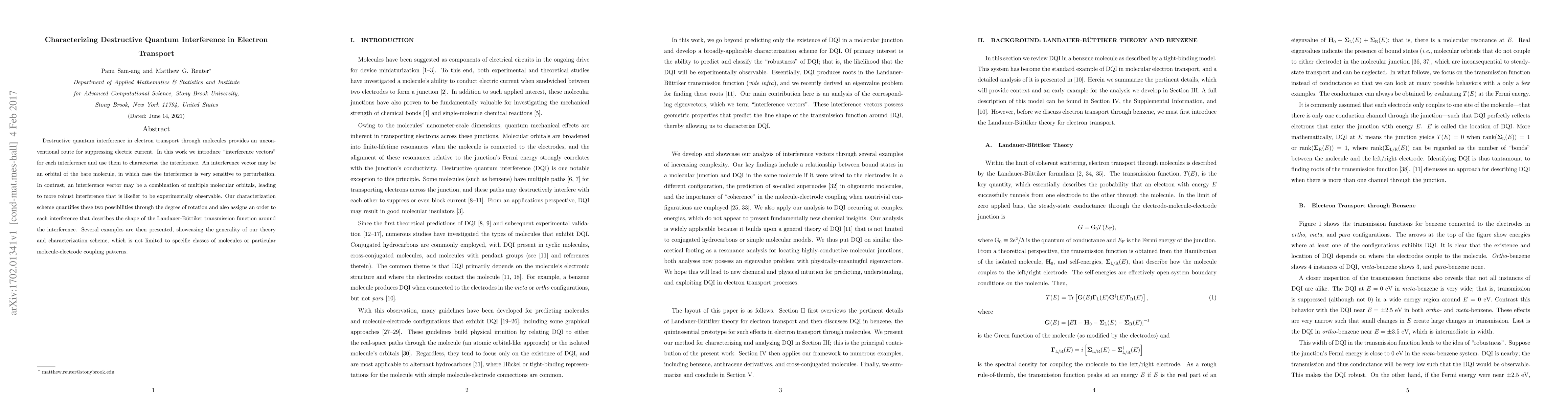 Destructive quantum interference in electron transport through molecules provides an unconventional route for suppressing electric current. In this work we introduce "interference vectors" for each interference and use them to characterize the interference. An interference vector may be an orbital of the bare molecule, in which case the interference is very sensitive to perturbation. In contrast, an interference vector may be a combination of multiple molecular orbitals, leading to more robust interference that is likelier to be experimentally observable. Our characterization scheme quantifies these two possibilities through the degree of rotation and also assigns an order to each interference that describes the shape of the Landauer-B\"uttiker transmission function around the interference. Several examples are then presented, showcasing the generality of our theory and characterization scheme, which is not limited to specific classes of molecules or particular molecule-electrode coupling patterns.
