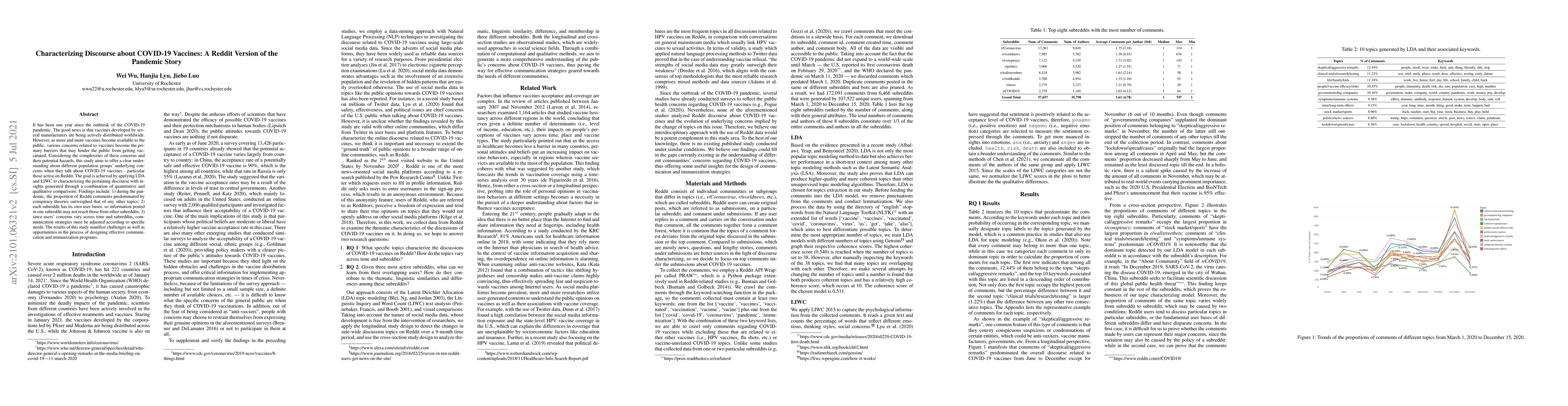 It has been one year since the outbreak of the COVID-19 pandemic. The good news is that vaccines developed by several manufacturers are being actively distributed worldwide. However, as more and more vaccines become available to the public, various concerns related to vaccines become the primary barriers that may hinder the public from getting vaccinated. Considering the complexities of these concerns and their potential hazards, this study aims to offer a clear understanding about different population groups' underlying concerns when they talk about COVID-19 vaccines, particular those active on Reddit. The goal is achieved by applying LDA and LIWC to characterizing the pertaining discourse with insights generated through a combination of quantitative and qualitative comparisons. Findings include: 1) during the pandemic, the proportion of Reddit comments predominated by conspiracy theories outweighed that of any other topics; 2) each subreddit has its own user bases, so information posted in one subreddit may not reach those from other subreddits; 3) since users' concerns vary across time and subreddits, communication strategies must be adjusted according to specific needs. The results of this study manifest challenges as well as opportunities in the process of designing effective communication and immunization programs.