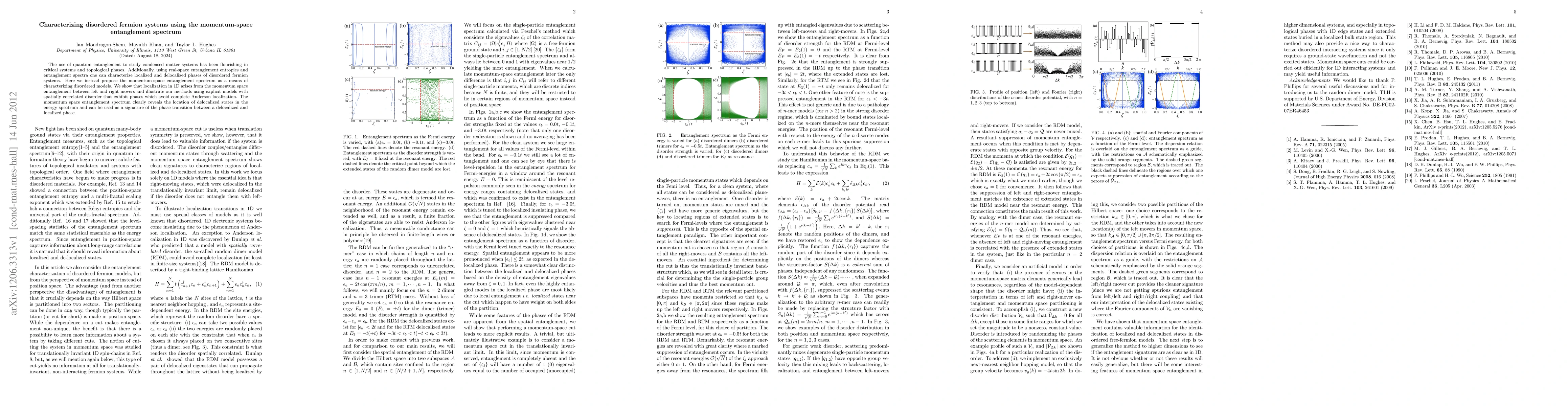 This paper proposes using the momentum-space entanglement spectrum to characterize disordered fermion systems, showing it reveals localization phenomena and the transition between delocalized and localized phases in 1D models with spatially correlated disorder. It highlights how entanglement between left and right movers indicates localization, providing a novel approach to understanding these systems.