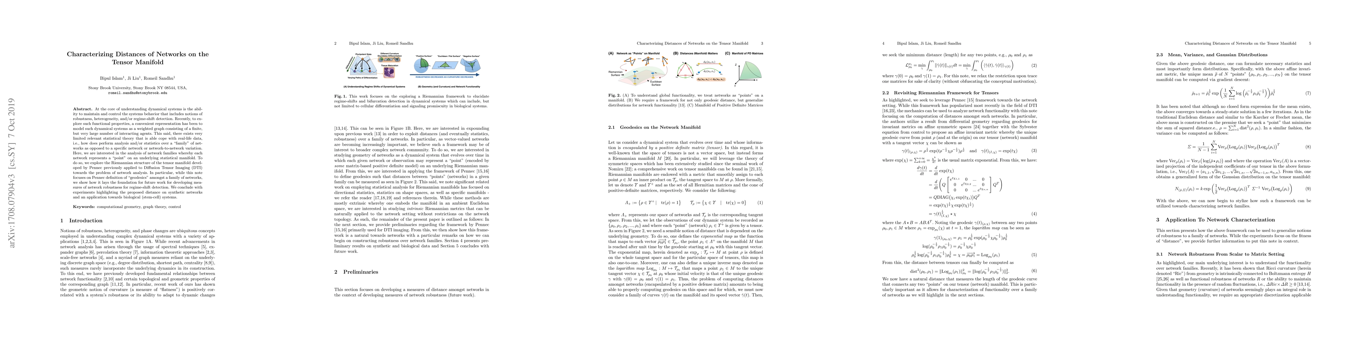At the core of understanding dynamical systems is the ability to maintain and control the systems behavior that includes notions of robustness, heterogeneity, or regime-shift detection. Recently, to explore such functional properties, a convenient representation has been to model such dynamical systems as a weighted graph consisting of a finite, but very large number of interacting agents. This said, there exists very limited relevant statistical theory that is able cope with real-life data, i.e., how does perform analysis and/or statistics over a family of networks as opposed to a specific network or network-to-network variation. Here, we are interested in the analysis of network families whereby each network represents a point on an underlying statistical manifold. To do so, we explore the Riemannian structure of the tensor manifold developed by Pennec previously applied to Diffusion Tensor Imaging (DTI) towards the problem of network analysis. In particular, while this note focuses on Pennec definition of geodesics amongst a family of networks, we show how it lays the foundation for future work for developing measures of network robustness for regime-shift detection. We conclude with experiments highlighting the proposed distance on synthetic networks and an application towards biological (stem-cell) systems.